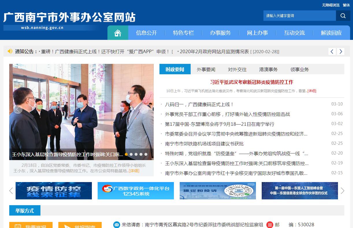 南宁市外事办公室主要职责:(一)贯彻执行党和国家对外工作方针政策、法律法规和自治区党委、自治区人民政府以及市委、市人民政府外事工作决策部署。协调推进南宁市对外交流合作。研究制定南宁市外事工作发展规划和年度计划并组织实施,归口管理、指导和协调全市外事工作和重大涉外事务,负责市内外事工作联系指导、情况通报、监督检查和业务培训等工作。(二)围绕对外开放、参与国际性、地区性区域合作开展调查研究,为市委、市人民政府外事工作决策提供意见建议。负责外事工作政策研究,起草我市外事工作规章制度草案和规范性文件,完善外事管理相关政策规定,并负责组织实施和督查检查。 利用外部资源和对外工作渠道,推动南宁市参与国际性、地区性区域交流与合作。(三)负责因公出访管理工作。根据自治区有关部门授权审核审批因公派遣团组出国、赴港澳特别行政区访问的有关事项。审核或协助办理我市举办国际性会议和涉外活动报批手续。统筹协调市领导对外交往事宜。(四)负责因公来访管理工作。负责邀请国(境)外人员来访有关事项。组织接待外国到访的国宾、党宾、议会外宾和其他重要外宾。组织接待来邕访问的港澳特区政府重要官员。(五)负责涉外安全和领事保护工作。配合公安部门做好境外非政府组织和我市社会组织参加境外非政府组织活动的管理,处理和协助处理我市重大涉外和涉港澳案件、涉外突发事件。提供对外表态口径,会签我市重要涉外报道和涉外稿件。(六)负责我市同我驻外使领馆和外国驻华外交、领事机构的工作联系。配合上级外事部门接待和管理来我市从事公务活动的外交人员。归口管理外国记者、港澳记者来邕的采访活动。(七)负责协调南宁领馆区有关建设事宜以及物业管理与服务工作。(八)归口管理、指导和协调我市与港澳特区的交往事项。 处理有关涉港澳事务。(九)负责我市重要外事活动礼宾事宜。(十)负责开展我市国外友好城市工作,指导民间对外友好交往活动。(十一)指导和协助处理在我市外国人管理重要事项。(十二)代管南宁市人民对外友好协会。(十三)完成市委、市人民政府交办的其他任务。