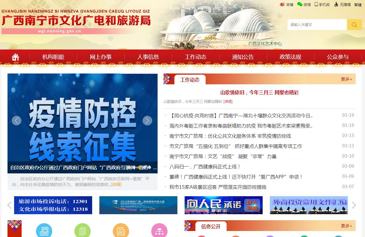 南宁市文化广电和旅游局主要职责:(一)组织拟订文化广播电视、网络视听节目服务管理和旅游地方性法规、规章和规范性文件,并组织实施和监督检查。(二)统筹规划全市文化广播电视事业及文化广播电视和旅游业发展,拟订发展规划并组织实施,推进文化广播电视和旅游与相关产业融合发展。推进文化广播电视和旅游体制机制改革。指导行业精神文明建设。(三)管理全市性文化广播电视和旅游活动,组织旅游整体形象推广,促进文化广播电视和旅游产业对外合作和国内外市场推广,制定旅游市场开发战略并组织实施。指导推进全域旅游、特色旅游、乡村旅游、红色旅游。(四)指导全市文化广播电视和旅游重点设施、重大项目建设。监测文化广播电视和旅游产业经济运行,负责文化广播电视和旅游统计分析和信息发布工作。(五)负责推进全市公共文化事业发展,推进全市公共文化服务、广播电视和旅游公共服务体系规划、建设和管理工作,深入实施文化惠民工程,统筹推进基本公共文化服务标准化、均等化和旅游公共服务标准化建设。组织实施全市广播电视公共服务重大公益工程和公益活动,扶助贫困地区广播电视建设和发展。(六)推进全市文化广播电视和旅游科技创新发展,推进金市文化和旅游行业信息化、标准化建设。推进广播电视与新媒体新技术新业态融合发展,推进广电网与电信网、互联网三网融合。指导行业职业教育及人才队伍建设。(七)指导全市文化旅游市场发展,负责文化旅游市场经营、广播电视机构、网络视听节目和公共载体传播的视听节目行业监管,推进文化和旅游行业信用体系建设。指导旅游保险工作,按管理权限负责全市入境、出境、国内旅游业务管理。指导监督、协调管理文化广播电视和旅游系统安全、应急救援工作,协调和指导全市假日旅游工作。(八)指导、监督全市文化广播电视和旅游市场综合执法工作。组织查处文化、广播电视、网络视听节目服务和旅游等违法行为,督查督办大案要案,维护市场秩序。(九)指导、管理全市文化广播电视和旅游对外及对港澳台交流合作和宣传推广工作。组织实施大型文化广播电视和旅游对外及对港澳台交流活动。推进国际及地区航线培育及开发工作。(十)指导、管理全市文艺事业,指导艺术创作生产,扶持体现社会主义核心价值观、具有导向性代表性示范性的文艺作品,推动各门类艺术发展。(十一)组织实施全市文化和旅游资源普查、挖掘、保护和利用工作。组织培育文化创意、动漫等旅游新产品,推动文化旅游商品开发。(十二)管理全市广播电视阵地,指导协调广播电视宣传活动,指导实施广播电视节目评价工作。(十三)负责全市广播电视节目传输覆盖、监测和安全播出监管,指导推进全市国家应急广播体系建设。指导、协调全市广播电视系统安全和保卫工作。(十四)负责全市非物质文化遗产保护、保存工作,组织实施非物质文化遗产调查、传承和传播。(十五)组织协调文物资源调查,文物保护和考古工作,承担文物资源资产管理、合理利用和文物安全工作,指导全市博物馆、文物管理等机构业务建设。(十六)按照《中华人民共和国安全生产法》和其他有关法律、法规的规定,在职责范围内对有关行业、领域的安全生产工作实施监督管理。(十七)完成市委、市人民政府交办的其他任务。