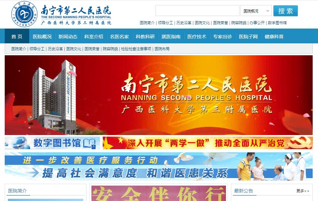 南宁市第二人民医院(广西医科大学第三附属医院、广西医科大学第三临床医学院)始建于1952年,是一所集医疗、急救、教学、科研、预防、保健、康复为一体的三级甲等综合性医院。医院医疗集团包括院本部、市儿童医院、市第二妇幼保健院、市第二人民医院五象医院、江南区人民医院、良庆区人民医院、空港医院、良庆镇中心卫生院、蟠龙西邻家广场服务中心社区医院、福建园社区卫生服务中心、大沙田街道前进社区卫生服务中心。目前医院编制床位数为2025张(其中院本部1160张、五象院区365张、龙岗院区500张)。医院是全国文明单位、全国卫生计生系统先进集体、全国无偿献血促进奖单位奖、全国医院后勤管理创新示范单位、全国卫生文明先进集体、2013-2017年度全国创建“平安医院”活动表现突出集体、2018年度管理创新医院、全国卫生文化建设先进单位、全国后勤保障与建设先进单位、自治区卫生先进单位、自治区军(警)共建精神文明先进单位、自治区法治宣传教育先进集体等荣誉。2018年12月医院入选国家148个建立健全现代医院管理制度试点单位,成为广西4家试点医院之一。医院现有职工2648名,其中高级卫生技术人员307人、中级卫生技术人员555人;硕士生导师29人,博士13人,在读博士11人。医院1993年起成为广西医科大学第三附属医院;1997年成为南宁市级首家三级甲等医院;2007年先后成为广西全科医学教育临床技能培训基地、广西住院医师培训基地、国家全科医生培训基地;2013年获得国家食品药品监督管理局(SFDA)颁发的《药物临床试验机构资格认定证书》,成为南宁首家药物临床试验机构;2014年成为国家级首批住院医师规范化培训基地,7月以优异成绩顺利通过自治区卫生计生委三级甲等综合医院等级复审;2015年成为南宁市级首家获得产前诊断资质的综合医院,国家级皮肤医疗美容示范基地;2016年成为广西远程医学中心南宁分中心;2016年被评为城镇基本医疗保险AAA级定点医疗机构,顺利通过第九批中国胸痛中心认证,荣获中国卒中学会首届“卒中先锋银奖”;2017年成立I期临床研究中心、精准医学研究中心,2017年获中国介入超声培训基地,广西新生儿专科护士临床培训基地,广西老年护理专科护士临床培训基地、同年神经外科获全国“优质护理服务表现突出病房”荣誉称号、2018年儿科获第二批广西妇幼健康服务重点建设学科、南宁市危重孕产妇救治中心、南宁市危重新生儿救治中心。2019年5月,医院成为国家高级卒中中心单位;2019年6月,医院成为广西伤口造口失禁专科护士临床培训基地;2019年7月,荣获2018年国家级母婴优质服务单位,是广西唯一一家获此殊荣的综合性医院;2019年9月,医院核医学科荣获中国合格评定国家认可委员会颁发ISO15189实验室认可证书(广西首家)。医院设有47个医疗专业科室,13个医疗中心(国家标准化代谢性疾病管理中心、高级卒中中心、第九批中国胸痛中心、广西南宁生殖医疗中心、广西肢体延长中心、广西远程医学中心南宁分中心、南宁市放射诊断质量控制中心、南宁市病案质量控制中心、南宁市药学质量控制中心、南宁市新生儿医疗质量控制中心、南宁市临床麻醉质量控制中心、南宁市危重孕产妇救中心、南宁市危重新生儿救治中心),8个自治区重点专科(儿科、神经外科、麻醉科、产科、内分泌科、妇科、医学影像科、皮肤性病科),2个研究所(南宁市颅脑创伤研究所、南宁市骨科疾病研究所),1个广西医疗卫生重点学科(儿科),1个广西医疗卫生重点培育学科(重症医学科),3个南宁市重点学科(生殖医疗中心、肿瘤科、放射科),4个南宁市人才小高地(南宁市药物临床试验研究人才小高地、南宁市慢病护理创新人才小高地、生殖医疗中心、神经外科),16个临床教研室(组),2个社区卫生服务中心(南宁市江南区福建园街道福建园社区卫生服务中心、南宁市良庆区大沙田街道前进社区卫生服务中心)。医院的广西南宁生殖医疗中心是广西首家生殖医学机构,是全国较早成立的生殖医学机构之一,也是南宁目前唯一获得卫生部批准正式开展供精人工授精技术的生殖医疗中心,创造了广西生殖医学领域“三个第一”(即广西首例试管婴儿、广西首例卵胞浆内单精子显微注射试管婴儿、广西首例冷冻胚胎试管婴儿)。生殖医疗中心先后获得“全国巾帼文明岗”、2017-2018年度“全国青年文明号”荣誉称号。医院积极引进国内外新技术和设备,现拥有先进的西门子3.0T核磁共振(MRI)、数字减影血管造影系统(DSA)、直接数字化X线成像(DR)、直线加速器、GE 64排螺旋CT及16排CT、全自动生化分析仪、以及一大批各种型号的先进的呼吸机、麻醉机、彩超、腹腔镜等设备,拥有医学影像信息系统(PACS系统)、手术实时转播系统、洁净层流手术室、实验室等高精尖医疗设备,为精准高效的诊疗和承担重大科研课题项目提供了重要保障,满足广大人民群众的医疗卫生服务需求。