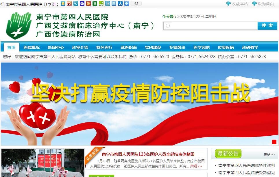 南宁市第四人民医院是广西区域内规模较大、南宁市唯一的一所以感染、传染及急、慢性相关性疾病群体为主要服务对象,集医疗、预防、保健、康复为一体,并具备教学、科研功能的三级甲等专科医院。医院成立于1961年10月,占地面积约8.6万平方米,建筑面积5.2万平方米,编制床位550张,应急床位40张,门诊面积8.6万平方米。截至2019年2月28日,全院在职职工有831人(编内491人、编外340人),卫生技术人员726人,其中高级职称140人(正高27人、副高113人),中级职称231人;研究生学历129人,本科学历351人。设艾滋病科(门诊和3个病区)、结核病科(门诊和4个病区)、肝病科、外科、内科、儿科、妇产科、重症医学科、血液净化科、中医科等14个临床科室和检验科、放射科、药学部、病理科等11个医技科室,设社区卫生服务中心1个,社区卫生服务站2个。医院是各种法定传染病和新发突发传染病病人救治的自治区级和市级定点医院,是广西艾滋病临床治疗中心(南宁)、广西医科大学附属南宁市传染病医院、国家卫健委(原卫生部)艾滋病临床培训基地、广西北部湾经济区传染病防控重点建设单位,是解放军总医院第五医学中心(原中国人民解放军第三〇二医院)合作医院、北京佑安医疗联盟医院、北京地坛医院技术协作医院、全国结核病联盟医院。相继建立广西传染病领域首个院士专家工作站——王福生院士工作站,建立施焕中专家工作站、廖万清院士工作站,获批设立第四批广西博士后创新实践基地,组建传染病专科医疗联合体。医院以艾滋病、结核病、肝病和其他传染病诊疗及其危重症救治、感染性疾病的检验检查为特色与优势,其中多数诊疗技术属广西领先水平,部分技术达国内先进水平。感染性疾病科是广西壮族自治区临床重点专科,艾滋病临床中心、结核病科、传染病护理为南宁市第三周期医学特色专科,结核病科为南宁市优势特色专科。同时,医院不断加强非传染病科的建设和发展,外科、内科、儿科、妇产科、中医科均设置有住院病区和门诊,还开设有口腔科、皮肤科、五官科、预防保健科等专科门诊,对各专业的常见病、多发病诊疗也达到三级医院水平。医院以“为生命站岗”为核心价值观,以“勇于担当、甘于奉献”为医院精神,以“奉献、自强、严谨、廉洁、超越”为院训,医院的愿景是全力打造“五个中心”,即区域性的艾滋病临床治疗中心、结核病临床治疗中心、肝病临床治疗中心、突发传染病公共卫生事件救治中心和感染性疾病检验中心,努力把医院建设成为“立足首府、服务广西、面向东南亚,紧跟一带一路,国内一流的现代化三级甲等传染病医院”。