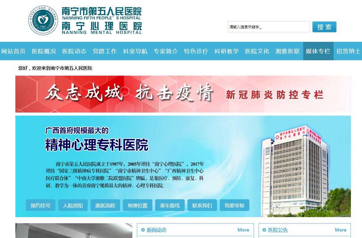 南宁市第五人民医院•南宁心理医院是广西唯一的心理卫生、精神卫生独立挂牌的国家三级精神病专科医院,承担广西西南部近3000万人口精神疾病的防治康复技术指导。医院坐落在广西首府南宁市东北面的狮山公园景区(南宁市邕武路7号),占地面积72.5亩,总建筑面积56660㎡,建筑密度为21.3% ,绿地率41.3% 。医院环境幽雅、景色秀美,交通便捷,为广西三星级绿色环保医院。医院成立于1987年,2005年挂牌“南宁心理医院”,是广西首家心理医院,是集医疗、预防、康复、科研、教学为一体的首府南宁规模最大的精神、心理专科医院,是广西精神卫生中心医疗联合体单位、南宁市精神卫生中心,南宁精神卫生专科医疗联合体牵头单位,与中南大学湘雅二医院、南宁市第一人民医院互为医联体单位。医院是广西医科大学、广西中医药大学临床教学医院,广西大学、广西师范学院应用心理学临床教学实习基地,广西高等医学院校临床教学基地(A级),担负广西精神、心理卫生专业人员的进修培训及各院校的见习、实习等教学任务。医院拥有首府南宁最优秀的专科人才和专业设备,诊疗、康复技术区内领先,对各类心理、精神疾病有深入的研究,有丰富临床经验和科研成果,医疗技术和服务水平得到社会各界、广大群众和患者的高度评价。医院先后荣获中国百佳百姓信赖的精神卫生医疗服务机构、自治区助残先进单位、自治区卫生先进单位、自治区先进基层党组织、自治区“文明小区”、“文明庭院”、广西、南宁市“绿色环保医院”、南宁市文明单位、南宁市绿化先进单位、南宁市警民共建先进单位等称号。截止至2017年6月,医院在职职工551人,其中专业技术人员499人,中、高级技术职称者近181人。年收治住院病人6000余人次,年专科门诊量达8万余人次。医院编制床位600张,实际开放病床600多张,临床共11个病区,包括成人精神科病区、情感障碍病区、物质依赖科、老年精神科、心理科森田病区、心理科睡眠障碍病区、儿童青少年心理病区、康复医学科等,其中,临床心理科获南宁市列为“重点学科”。心理科、精神科门诊开展了精神分裂症、焦虑症、神经症、强迫症、恐怖症、儿童多动症、儿童青少年心理行为障碍、心身疾病、性心理障碍、心理咨询、心理测量、药物依赖及酒精依赖、老年精神病、癫痫、睡眠障碍和社区心理应急干预等专科业务,还开展了急诊科、内科、外科、妇科、儿科、口腔科、五官科、中医科、康复中心等综合业务。医院同时担负广西精神疾病司法鉴定、精神疾病劳动能力评定、精神疾病残疾评定,为广西壮族自治区十佳司法鉴定机构。心理科森田病房以园林生态模式建造,为医院亮丽业务名片,集诊疗、园林、家居为一体,森田疗法区内首创,国内先进。医院坚持以创新意识为先导,秉承“仁和、精谨、务实、创新”的医院精神,坚持“人文关怀、心身致和”的服务理念,加强内涵建设,强化科学管理,突出专科特色,以一流技术和服务,为患者提供了一个优美、温馨、安全、舒适的诊疗康复环境。