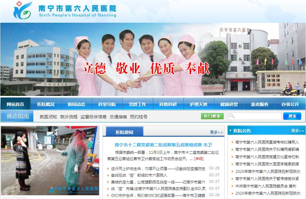 南宁市第六人民医院位于南宁市西乡塘区秀灵路38号,是一所集医疗、预防、保健、科研为一体的二级甲等综合医院,主要承担附近居民及周边十余所高、中等院校教师、学生等30万人口的医疗卫生保健工作,同时承负辖区院前急救及首府各项重大活动的医疗保障工作,是区直、市直职工医疗保险、城镇居民医保和平安保险、太平洋保险定点医院、低保对象医疗救助定点医院、新农合定点医疗单位。医院设有急诊科、内科、外科、产科、妇科、儿科、中医科、手术麻醉科、五官科、口腔科、皮肤性病科、预防保健科、社区卫生服务中心等主要科室;能独立开展神经科、泌尿外科、骨外科、妇科、产科、五官科等专科各种较重大手术;以妇科盆底康复、产科镇痛分娩、小儿疾病、儿科新生儿重症监护、内科心血管疾病诊治等为专科专长,在新生儿疾病诊治、妇产科疾病诊疗领域有独特的治疗方案及效果;对心脏病、高血压、糖尿病等内科慢性疾病开展特色中医治疗。医院拥有16排螺旋CT、数字胃肠机、DR、四维彩超、全自动生化分析仪、电子胃镜、腹腔镜、可视人流仪、数码电子阴道镜、妇科炎症生理修复治疗仪等较高端医疗设备。医院住院环境优美,病房舒适,设有独立卫生间、电视机、空调、热水、全自动消防安全设备等设施,为您提供优质的医疗护理服务。医院坚持“病人第一、质量第一、社会效益第一”和全心全意为人民服务的办院宗旨,竭诚为广大患者提供全程优质的医疗服务,广泛得到群众的好评,具有良好的社会声誉,是一所让老百姓放心的医院,医院实行24小时接诊绿色通道,双休日、节假日照常开诊。