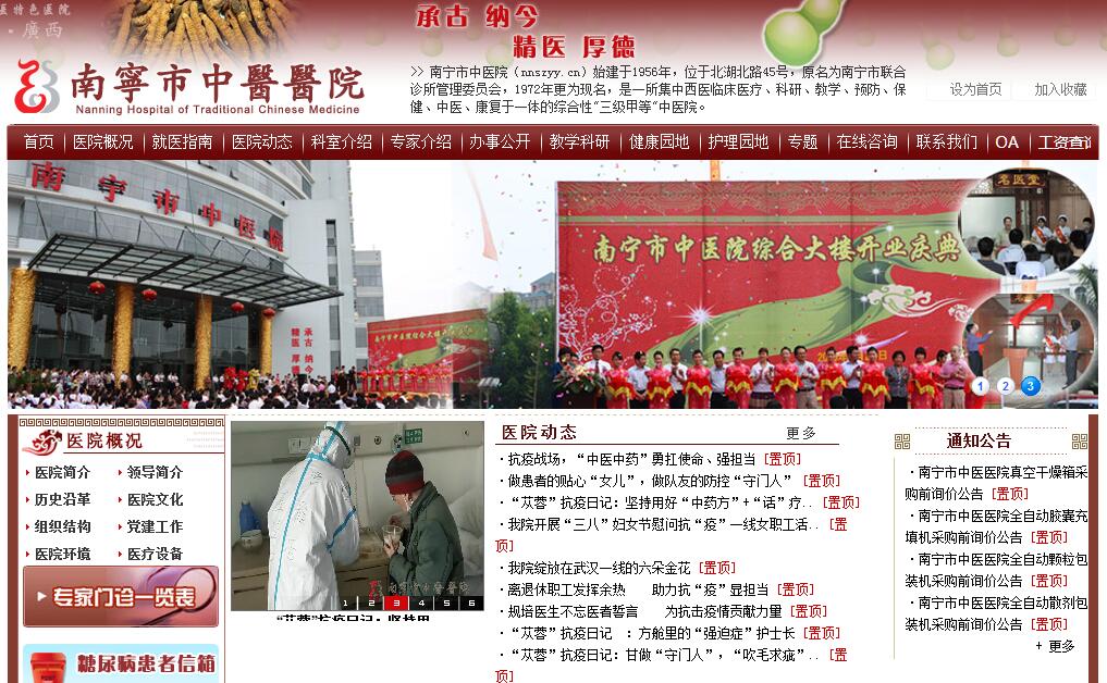 南宁市中医医院始建于1956年,经过60多年的建设发展,现已成为一所集临床医疗、科研、教学、预防、保健、康复、制剂、养老于一体的三级甲等中医医院,是广西中医药大学附属医院,广西高等医学院校A级临床教学基地,自治区、南宁市城镇职工、居民基本医疗保险、新农合定点医院,国家第二批住院医师规范化培训基地,第一批南宁市急性脑卒中救治定点医院。医院包括北湖、新华两个院区,北湖院区位于广西壮族自治区首府南宁市北湖北路45号,新华院区位于南宁市新华路28号,总占地面积18029.55 平方米,建筑面积56434.01平方米;编制床位650张,开放床位720张。现有职工910人,其中具有正高职称11人,副高职称95人,中级职称卫技人员285人,研究生100人;现拥有广西名老中医1人,广西名中医1人,南宁市名中医4人。拥有临床科室22个,医技科室7个,行政职能科室21个;社区服务中心1个,社区卫生服务站3个;开设南宁市急救医疗中心秀厢急救站。其中,脑病科为国家中医药管理局“十二五”重点专科,骨伤科为自治区中医药管理局重点专科,妇产科、脾胃病科获得自治区卫计委2017年广西市县级三级中医医院重专科建设项目立项。2018年荣获中国卫生管理创新医院、跻身中国中医医院竞争力排行榜300强医院,2017-2019连续三年荣获自治区卫健委宣传先进单位、2019年荣获南宁市级文明单位等荣誉。目前南宁市中医医院江南分院和失能老人康复综合养护院(南宁第一养护院)两个重大项目已立项筹建中。医院重视中医理论传承与创新,中医技术的引进与推广。医院运用非药物治疗手段多达62种,覆盖全院每个临床科室,充分发挥了中医药特色优势。脑病科独创的中草药循经推按按摩棒、骨伤科发明的一种桡骨远端骨折复位固定器获得国家实用新型专利和发明专利。医院注重经典膏方的研制与应用,根据南方气候特点和人体体质研制出了系列经典膏方,成功举办五届膏方节,深受群众欢迎。医院制剂特色突出,能生产胶囊剂、颗粒剂、膏剂、酊剂和口服液五个剂型十八个品种。这些中药制剂用于中风、跌打扭伤、风湿骨痛、风热感冒、热毒壅结症、气血亏虚、肝肾不足诸症等的治疗疗效显著,深受国内外患者欢迎。医院不仅重视发挥中医传统优势,同时注重现代医学的成果,适应时代的发展,满足患者的需要,拥有核磁共振、CT机、DR、C型臂X光机、高端多普勒超声诊断仪、全自动生化分析仪等大型医疗设备,具备了较强的中西医综合诊治能力。随着中医药在国际上的影响不断加深扩大,医院积极响应国家“一带一路”建设,在市卫健委的领导下,医院选派专家及医护人员赴波兰鲁琼兹市中医针灸推拿及慢性疼痛治疗中心开展工作,进行中医药学术研讨、中医适宜技术培训及诊疗工作,积极探索和寻求中医药对外交流领域的新机遇。面对新机遇新征程,医院将继续坚持“弘兴医道、佑泽民众”为办院宗旨,秉承“承古纳今,精医厚德”之院训,践行“诚信、仁爱、敬业、创新”之精神,以建设平安医院、智慧医院、如意医院、节能医院、清廉医院为目标,坚持走中医特色发展,创新发展、质量发展道路,推进现代管理建院,人才发展立院,中医特色兴院、综合实力强院的发展战略,大力弘扬中医药文化,为努力建成患者如意、职工如意、社会如意的中医医院而不懈努力。