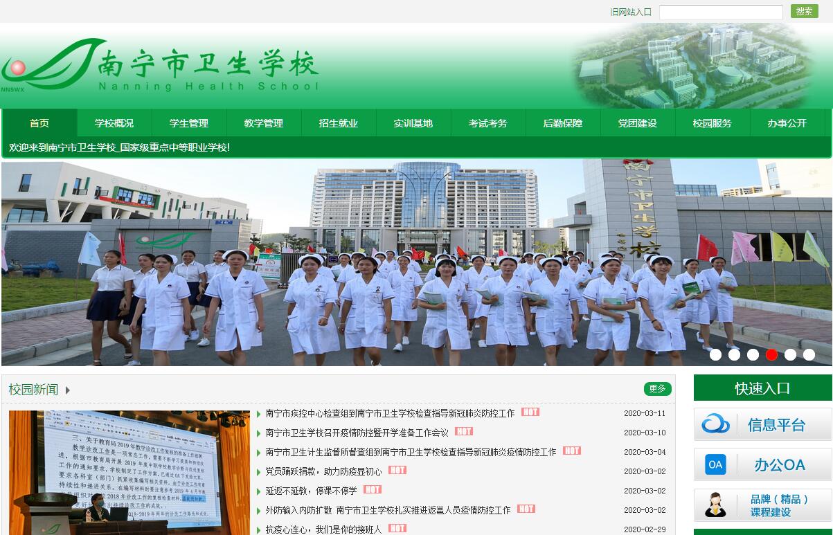漫步校园,风景如画;绿草葱葱,柳树依依。绿树掩映中,一幢幢整齐划一的教学楼巍然耸立,交相辉映,现代化的学生公寓楼、宽敞明亮的学生餐厅、木质地板的室内运动馆、塑胶跑道的田径运动场、藏书丰富的图书馆、电子阅览室、国内领先、区内独树一帜的的数字化校园网络、校园广播系统、电脑室、多功能电教室以及各种教学仪器、电教器材等校舍场馆一应俱全,现代化的教学与生活设施,满足了师生们的工作、学习和生活的需要。南宁市卫生学校始终坚持“每个学生都是才,每个学生都能成才”的教育理念,重视良好育人环境的构建,将职业文化融入校园环境建设之中,在教室、宿舍、花草绿地中悬挂、放置名言警句,在实训室的墙壁上悬挂着实训操作流程图等职业文化,塑造了“让每面墙壁都会说话,让每棵树木都能育人”的职教品牌,充分发挥了环境育人的功效。在这里,优雅怡人的校园环境与浓郁的校园文化融为一体,现代教育理念下人与自然和谐发展,物质化进程与厚重人文底蕴紧密结合的高品位校园得到了完美的诠释。根据中职行业学校的特点和需求,学校确立了以“把握时代脉搏、体现行业特征、面向市场需求、发展特色教育”为指导的职业教育(办学)理念和“每个学生都是才,每个学生都能成才”的教育理念;“对社会负责、对家长负责、对学生负责”的办学宗旨;以学生发展为本,“提高学生的就业竞争能力,提高学生的升学竞争能力,提高学生的可持续发展能力”的办学目标;确立了“以质量促就业、以就业促招生、以招生促发展”的战略思想。学校采取多元化、多层次、多渠道的办学模式。在抓好学历教育的同时,注重抓好短期职业培训。办学形式以全日制普通中专、“2+3”5年制高职、成人大专办学、中职直升大学本科等。开设有护理、口腔工艺技术、中医美容、中西医结合、医学检验、药品营销、药剂、助产、卫生保健、医学影像技术、中医推拿按摩技术11大专业。学校还根据市场需求,拓宽办学思路,先后与广西医科大学、广西中医药大学、桂林医学院、右江医学院等多所大专院校联合办学,充分发挥各自的资源优势,实现资源整合,优势互补,扩大办学规模,满足学生多层次教育的需求。自2001年起,学校还积极扶助农村卫生事业,与多所县级中等职业学校合作办学,提高了广西乡村医生学历和医疗技术水平。在如今招生竞争剧烈、招生市场混乱的情况下,学校提出,招生工作要以质量取胜,以服务取胜。为此,从2004年起学校招生就坚决抵制招生中介,一律取消招生中介费。专门成立了招生就业指导办公室和心理、就业指导教研组,派专人负责学校的招生工作,全校教职工从每一个细小环节做起,使新生接待中无一起投诉,学生流失率在5%以下。近年来,学校年年招生突破教育行政部门下达的招生任务且逐年增加,年年被评为招生先进单位。2015年招生3100多名,超额完成2500名的招生任务。目前学校在校生13402名,其中:全日制中职学生7560名、“2+3”高职生1278名、成人大专4564名,办学规模位居全区卫生类学校之首。学校坚持以学生为本,根据每个学生个性成长的不同特点和需求,采取分层教学,使A层的学生吃得精,提高升学竞争力;B层的学生吃得饱,在获取学历文凭的同时还获得多项职业技能证书,提高就业竞争力;C层的学生吃得了,确保掌握谋生的一技之长,为基层医疗卫生机构培养了近万名有思想、会沟通、懂技术“一专多能”的实用型卫生技能型人才,毕业生就业率达98.26%,“双证书”率达96.14%以上,毕业生遍布广西、广东、福建、海南等沿海城市,有力地促进了当地经济建设。为抓好短期职业培训和行业继续教育培训,学校专门成立了卫生职业教育培训中心,建立了国家职业资格鉴定所,为社会和在校生开设了妇幼保健员、月嫂、口腔修复工、美容师、化妆师、按摩师、B超、保健按摩、医药商品购销、眼镜验光员和眼镜定配等各种培训及职业资格鉴定,平均每年培训、鉴定人数达3000余人,为广西卫生职业教育和落实区人民政府《农村劳动力转移培训计划》工程做出了应有的贡献。卫生部职业技能鉴定指导中心将我校指定为口腔修复工培训基地;同时广西卫生厅也将学校指定为口腔执业医师资格考试培训基地和个体牙医考试培训基地以及全科医学教育培训基地。学校护理专业创立于1972年,是我校最具特色的重点专业之一,2005年获自治区首批示范性专业,护理实训基地也于2009年10月获批为自治区级示范性实训基地。该专业创办以来,共培养了上万名中、高级护理人才,护士生在尚未毕业就基本全部被用人单位选定,毕业生就业率达98%。由于出口的通畅,近年来我校护理专业招生均居全区之首,且逐年提升,2009年仅护理专业招生就达2293人,生源遍及区内外。现学校护理专业在校生人数达5435人,占在校生人数64.77%,已成为区内护理专业规模最大的学校。为适应市场对护理技能型人才的要求,学校加大了护理专业建设改革力度,在全区率先开设护理礼仪教学,承办礼仪师资培训班;首创社区护理实训基地;构建了集教学、科研、培训和技术服务为一体的现代化、开放式的自治区示范性护理实训基地;为加强学生实践能力的培养,学校充分利用校内和附属医院的教学资源,将临床教学分别在校内和附属医院交替完成,通过临床见习和实习,不仅提高学