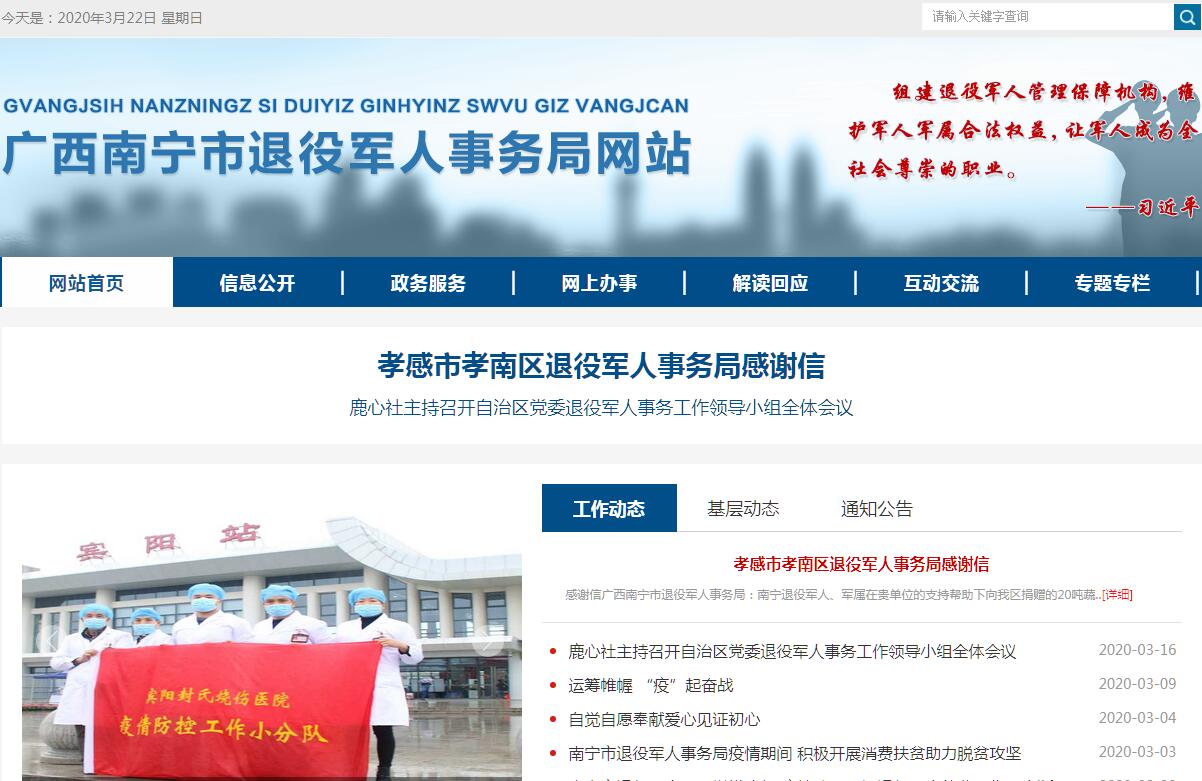 南宁市退役军人事务局主要职责:(一)拟订全市退役军人思想政治、管理保障和安置优抚等工作政策并组织实施,褒扬彰显退役军人为党、国家和人民牺牲奉献的精神风范和价值导向。(二)负责全市军队转业干部、复员干部、离休退休干部、退役士兵和无军籍退休退职职工的移交安置工作,以及自主择业、就业退役军人服务管理工作。(三)组织指导全市退役军人教育培训工作,协调扶持退役军人和随军随调家属安置、就业创业。(四)会同有关部门拟定退役军人特殊保障政策并组织落实。(五)组织协调落实移交地方的离休退休军人、符合条件的其他退役军人和无军籍退休退职职工的住房保障以及退役军人医疗保障、社会保险等待遇保障工作。(六)组织指导伤病残退役军人服务管理和抚恤工作,拟订有关退役军人医疗、疗养、养老等机构的规划政策并指导实施。承担不适宜继续服役的伤病残军人相关工作。组织指导军供服务保障工作。(七)组织指导全市拥军优属工作。负责现役军人、退役军人、军队文职人员和军属优待、抚恤等工作,贯彻落实国民党抗战老兵等有关人员优待政策并指导实施。(八)协助开展烈士及退役军人荣誉奖励、军人公墓管理维护纪念活动等工作,依法承担英雄烈士保护相关工作,审核拟列入全国、全区和全市重点保护单位的烈士纪念建筑物名录,协助上级部门做好境外我国烈士和外国在华烈士纪念设施保护事宜,配合做好总结表彰和宣扬退役军人、退役军人工作单位和个人先进典型事迹工作。(九)指导并监督检查全市退役军人相关法律法规和政策措施的落实,组织开展退役军人权益维护和有关人员的帮扶援助工作。(十)完成市委、市人民政府交办的其他任务。
