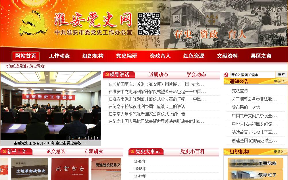 | 网站简介: 淮安党史网由中共淮安市委党史工作办公室主办。中共淮安市委党史工作办公室主要职能:1、承担重要党史资料的征集、整理、编纂工作,编写中共淮安地方史。2、编辑出版重要党史书刊,开展党史宣传教育。3、协助有关部门对拟公开宣传的党史资料进行政治把关,核准史实,对涉及地方党史、革命史及革命英烈的展览、纪念馆陈列进行审查。4、规划、部署全市的党史工作,组织协调党史资料的征编和党史专题研究工作。5、指导县区党史编纂等业务工作,开展学术活动,培训党史部门业务骨干,评定党史部门科研成果。6、完成市委和中央、省委党史部门交办的其他事项。 |
