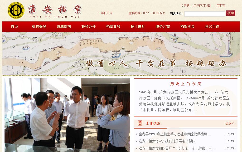 | 网站简介: 淮安市档案局(馆)为淮安市委、市政府直属正处级事业单位,依法履行档案行政管理职能。其主要职责是:(一)贯彻执行档案管理工作有关法律、法规和规章,并结合本地区实际制订具体执行意见。(二)对全市档案工作实行统筹规划、宏观管理。组织、指导、检查、监督、协调市直各机关、团体、企事业单位以及所辖县(区)档案管理工作。(三)负责全市专(兼)职档案人员的业务培训和初、中级档案专业技术职务任职资格评审的有关工作。(四)集中统一管理市委、市人大、市政府、市政协、市纪委及市级机关各部门的重要档案和资料,同时征集、接收撤销单位具有永久、长期保存价值的档案以及散失在社会上的各种珍贵档案、资料。(五)对馆藏档案、资料进行管理、编目、保护、鉴定、统计,并实施现代化、科学化管理。(六)依法接收市级机关、企事业单位到期档案进馆,开发利用档案信息资源,按时向社会公布、开放历史档案。(七)开展档案史料的编纂、研究工作,有计划地开展档案学理论研究。(八)完成市委、市政府及上级档案部门交办的有关事宜。 |