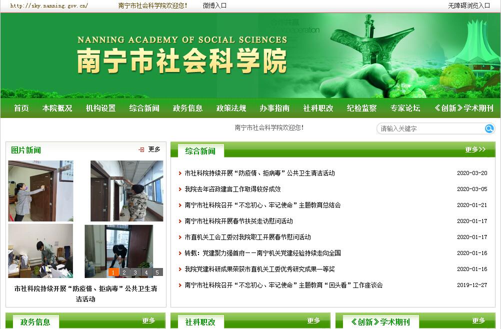 南宁市社会科学院是南宁市人民政府直属事业单位,于1998年5月组建。南宁市社科院在中共南宁市委、南宁市人民政府的正确领导下,坚持以马克思列宁主义、毛泽东思想、邓小平理论、“三个代表”重要思想和科学发展观为指导,深入贯彻习近平系列重要讲话精神,在社会科学研究、学术交流、理论宣传、编书办刊等方面做了大量工作,取得了一大批优秀社科研究成果,充分发挥了“认识世界、传承文明、创新理论、咨政育人、服务社会”的作用,为促进经济社会发展提供了智力支持,得到了市委、市政府领导的肯定和重视。近年来,南宁市社科院多次被授予 “南宁市先进单位”“全国城市社科院先进单位”等称号。南宁市社科院的主要职责是:拟订并组织实施南宁市社会科学研究规划;研究和论证南宁市改革开放和南宁市经济社会发展重大理论问题和实践问题;收集、分析、掌握社会思想理论动态和有关信息,定期与不定期提供有关问题的研究报告及各方面的动态信息,供市委、市政府决策参考;为部门、企业提供咨询服务;编辑出版社科公开理论刊物《创新》;编纂《南宁蓝皮书》、《南宁历史文化丛书》、《咨询与决策》;受市人民政府有关部门的委托,负责南宁市社会科学系列专业技术职称的组织、推荐、初审工作;完成市委、市政府交办的其他工作任务。南宁市社科院设有办公室、经济发展研究所、社会发展研究所、城市发展研究所、农村发展研究、东盟研究所、科研管理所、《创新》杂志编辑部等8个所(部、室)。编制共42名,现有在职人员37人,其中,高级专业技术职称13人,中级专业技术职称14人;博士6人,硕士14人;市级专业技术拔尖人才5名,市优秀青年专业技术人才5名,市级新世纪学术和技术带头人13人;长期聘请钟启泉、曾德盛等多名享受国务院特殊津贴专家和区内外知名专家担任本院特邀研究员。
