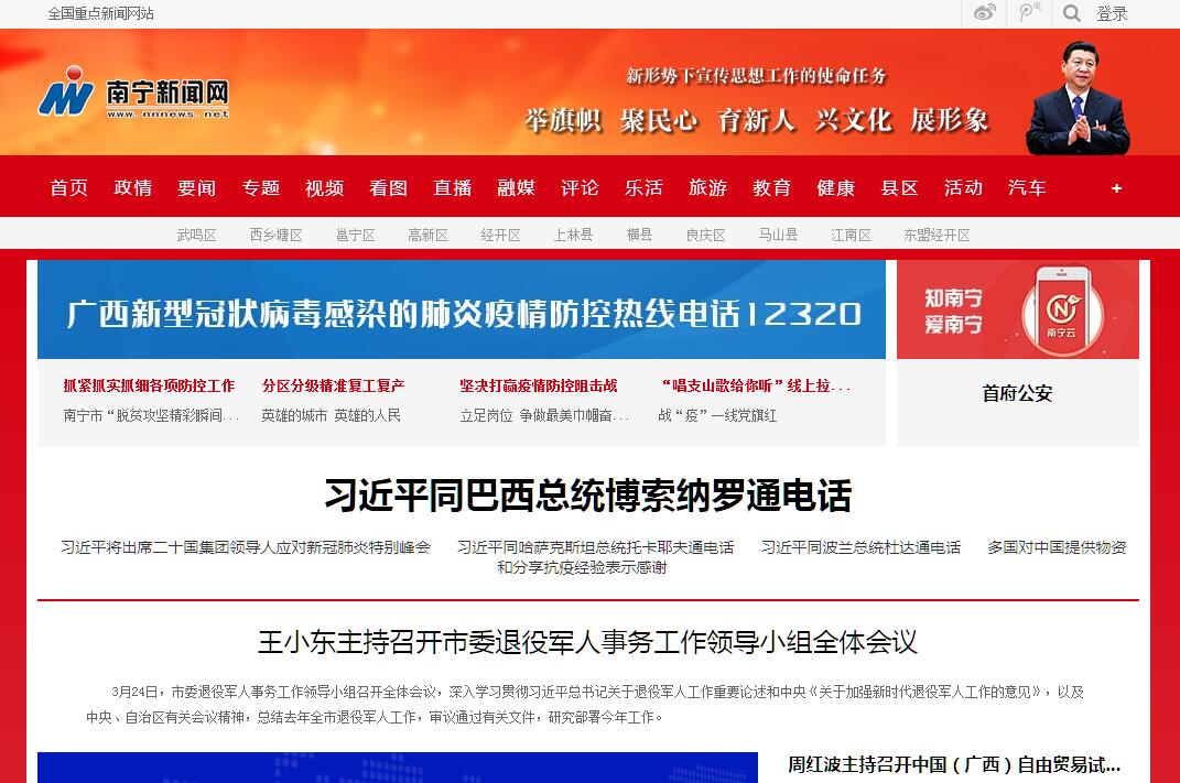 | 网站简介: 南宁新闻网是经国务院新闻办批准开办,由广西壮族自治区人民政府新闻办公室、南宁市委宣传部主管,南宁日报社主办的全国重点新闻门户网站。 |