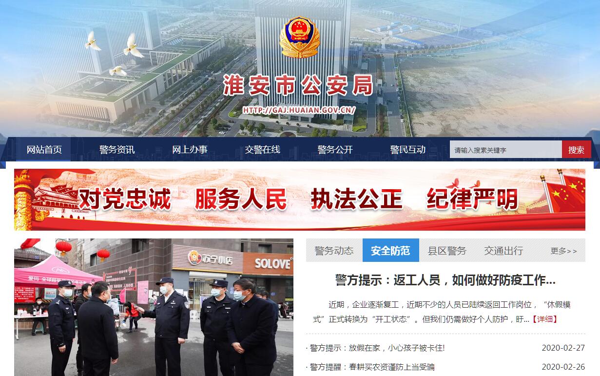 淮安市公安局是淮安市人民政府下设主管全市公安工作的职能部门,受市政府、江苏省公安厅双重领导。各县(县级市)区设公安局(分局),在镇、乡、街道设派出所;公安分局与派出所分别接受同级人民政府和上级公安机关领导。其主要职责是:(一)全面贯彻落实党和国家关于公安工作的路线、方针、政策以及国家法律、法规,指导、检查、监督全市公安工作。(二)掌握影响稳定、危害国内安全和社会治安的情况,分析形势,制订对策。(三)组织指导侦查工作,协调侦破和处置重大案件、重大治安事故和骚乱。(四)指导、监督全市公安机关依法查处危害社会治安秩序行为,依法管理危险物品和特种行业等工作。(五)依法管理国籍,负责出境、入境和外国人在我市居留、旅行的有关管理工作。(六)组织消防安全宣传,实施消防工作,依法进行消防监督。(七)指导、监督全市公安机关维护道路交通安全、交通治安秩序以及机动车辆、驾驶员管理工作,维护市区道路交通治安秩序。(八)指导、监督全市公安机关对国家机关、社会团体、企事业单位和重点建设工程的治安保卫工作以及群众性治安保卫组织的治安防范工作。(九)指导、监督全市公安机关对信息网络的安全监察工作。(十)指导、监督全市公安机关依法承担的执行刑罚和监督、考察工作;指导、监督登高公安机关对看守所、治安拘留所、诫毒所、收容教育所等管理工作。管理市看守所、诫毒所、治安拘留所与收容教育所。(十一)承办全市收容教养的审核报批工作。(十二)组织实施党和国家领导人及重要外宾来我市视察安全警卫工作。(十三)组织实施全市公安科技工作;规划公安信息技术、刑事技术和行动技术建设。(十四)为全市公安机关提供装备、被装配备等警务保障服务工作。(十五)领导全市公安消防部队建设,对武警支队执行公安任务及相关业务建设实施领导和指挥。(十六)组织指导全市公安机关人员培训、公安教育及公安宣传工作;按规定权限管理干部。(十七)组织、指导全市公安机关督察工作;按规定权限实施对干部的监督;查处或督办全市公安队伍重大违纪案件。(十八)承办上级交办的其他事项。