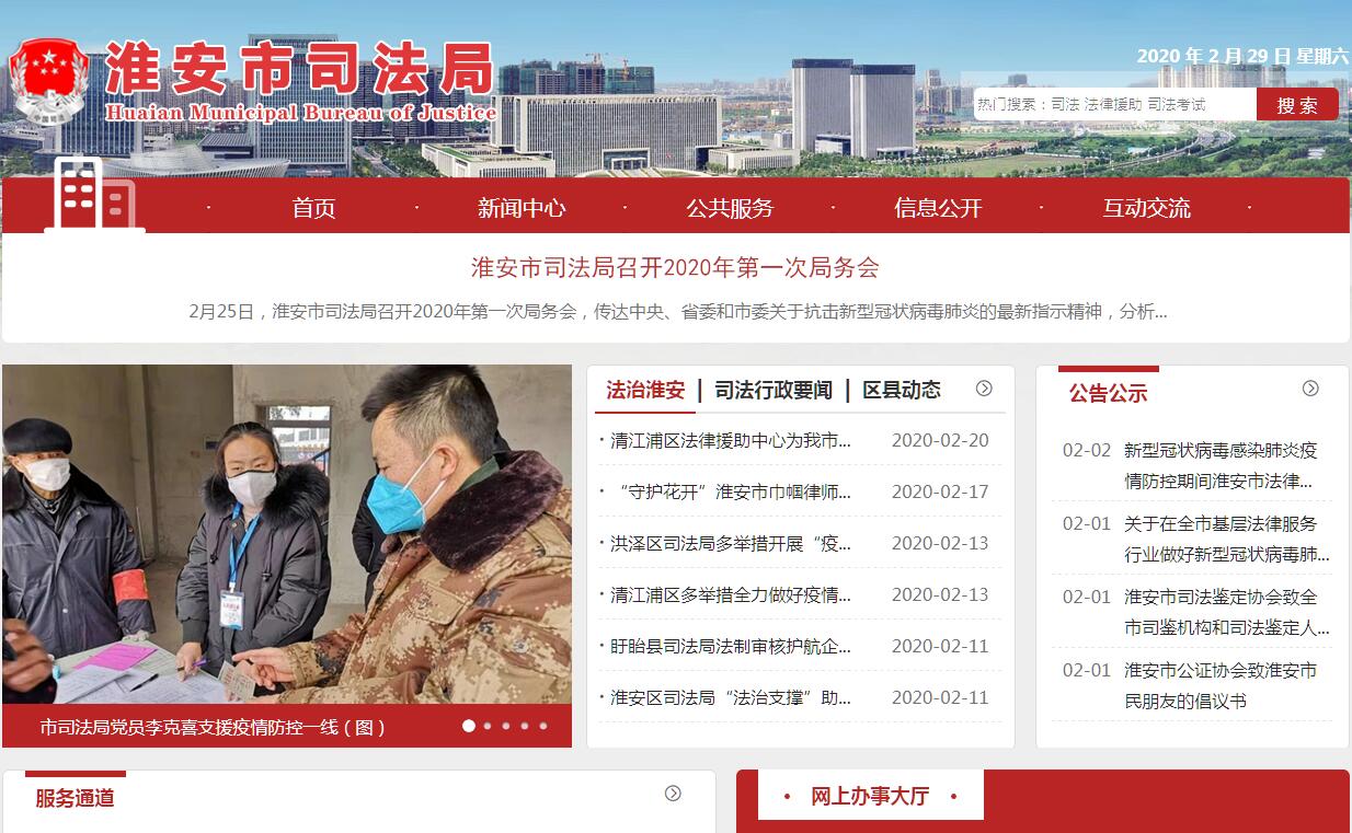 淮安市司法局是人民政府的职能部门,其主要职责是: 1、贯彻执行国家和省制定的有关司法行政工作的方针、政策、法律、法规、规章及目标和要求;拟定全市司法行政工作的规范性文件;编制全市司法行政工作的中长期规划、年度计划并组织实施。 2、拟定全市法制宣传与普法教育规划并组织实施;指导各地、各行业法制宣传工作。3、指导监督全市律师、公证和基层法律服务工作。4、指导监督全市基层司法所建设和人民调解、帮教安置工作,指导全市社会矛盾纠纷调解工作,参与社会治安综合治理工作。5、指导全市社区矫正工作。6、监督管理全市司法鉴定工作,负责全市司法鉴定人和司法鉴定机构登记管理的初审工作。7、监督管理全市法律援助工作;指导、协调全市12348法律服务专线工作。8、组织实施全市国家司法考试工作。9、指导监督全市司法行政系统依法行政、执法监督工作;指导司法行政系统对外交流合作,承办司法行政涉港澳台法律事务。10、指导全市司法行政系统队伍建设;管理局直属单位领导班子,协助管理各县(区)司法局领导干部。11、负责全市司法行政警用车辆管理工作;指导全市司法行政系统信息化建设。12、承办市政府和省司法厅交办的其他事项。