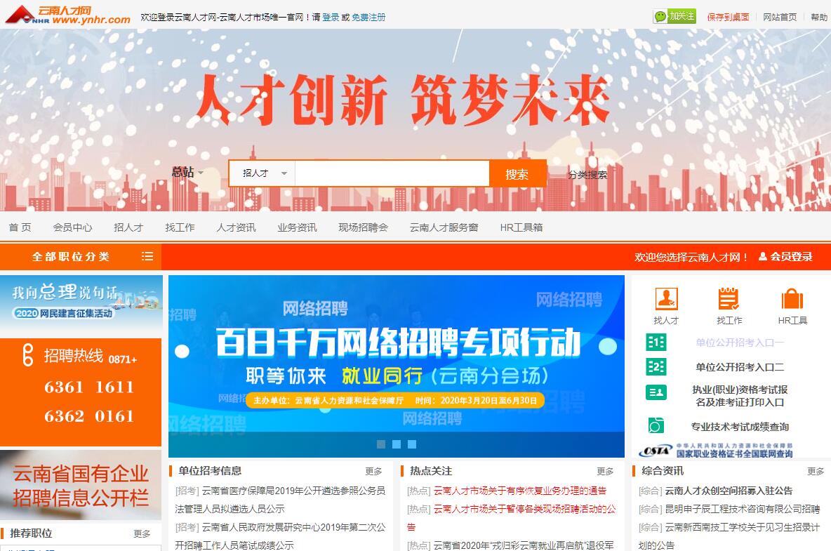 云南人才网-云南人才市场唯一官网。云南人才市场是云南省人力资源和社会保障厅直属事业单位, 是云南省最成熟、最权威、规模最大的政府人力资源专业服务机构。目前,市场有两块牌子,中国云南企业经营管理人才市场(原人事部与云南省人民政府共同组建的区域性人才市场)和云南人才市场。市场建有云南省人才众创空间、云南省人力资源开发创业园。上世纪末期,市场就在五华山、园林大厦等地举办招聘会,2004年经编办正式批准单列云南人才市场。多年来,在云南省人力资源和社会保障厅历届党组的坚强领导下,在市场全体员工的共同努力下,现已成为全省乃至全国人才服务行业较有影响力的知名品牌。市场始终坚持“以人为本、服务社会”的宗旨,以企业和人才需求为导向,按照专业化、信息化、产业化发展思路,逐步发展形成了覆盖人力资源服务全方位的完整的服务体系,服务范围覆盖了党政机关、部队、国有事业企业单位和非公有经济企业,服务人群广泛。市场积极发挥省级人才市场的辐射和示范作用以强有力的政府保障体系、完善的服务功能、为促进就业人才优化配置、引领行业健康发展、推动我省经济社会发展、带动人力资源服务业发展作出了积极贡献。云南人才市场内设部门8个:综合部、财务部、信息部、营销部、人才评价部、培训部、人事代理部、社保工作站;两家机构:云南润滇职业培训学校、云南人力资源开发中心职业培训站。