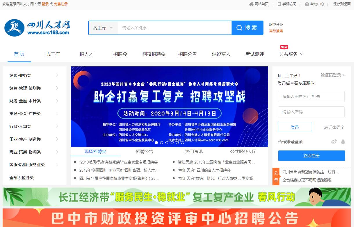 | 网站简介: 四川人才网(四川省人才网)www.scrc168.com成立于2001年,是四川全盛人才官方招聘求职网站,是四川极富影响力的专业人才网站,年访问量达300万人次,为近3000家用人单位及10万余人次的流动人才提供诚信可靠、专业高效的招聘求职服务。人才信息量大、影响覆盖面广、招聘效果好、投入少回报多、人才匹配信息化是我们的服务特色,竭诚欢迎广大企事业单位来我站招聘人才!企业在我站招聘主要有会员服务和网络广告两种基本形式,其它的特色服务还有中高级人才猎头、人才培训等。 |