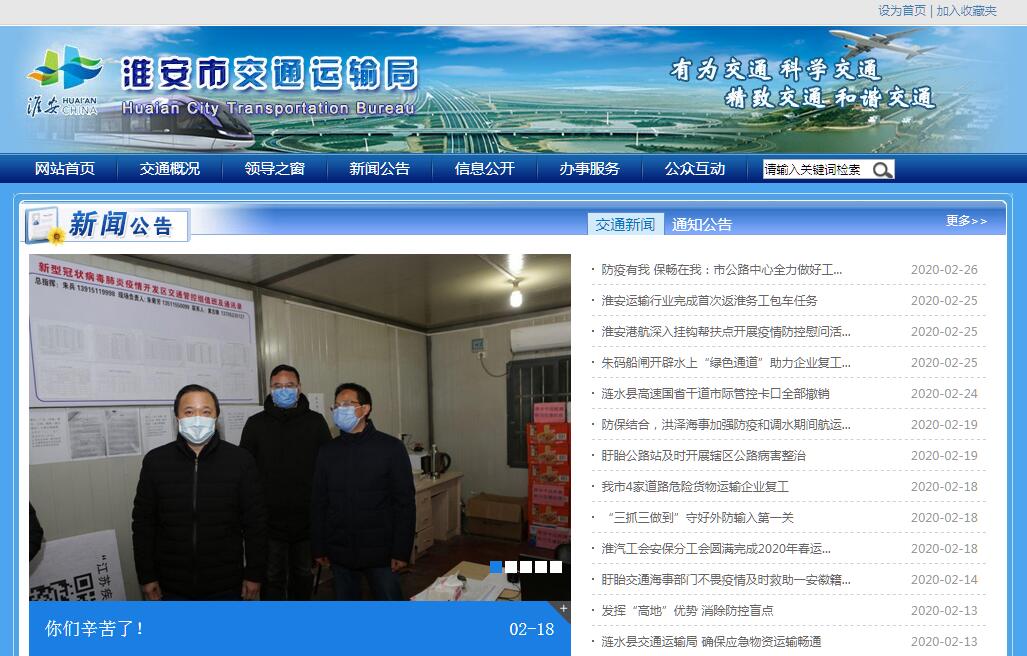 淮安市交通运输局主要职责是:(一)贯彻执行国家和省有关交通运输的方针政策、法律法规;组织起草并监督实施全市有关交通运输工作规范性文件,指导全市交通运输行业体制改革工作。(二)组织编制全市综合运输体系规划,组织拟订并监督实施全市公路、航道、港口、站场、地方铁路、民用航空和交通物流业等行业发展规划和计划;组织编制城市客运发展规划和交通运输枢纽规划;参与城市公共交通、城市客运有关设施的规划;会同有关部门编制交通运输固定资产投资计划;负责交通运输行业统计和信息发布工作。(三)组织实施国家、省、市重点和大中型交通工程建设;负责全市交通基础设施建设和维护的行业管理工作;负责全市港口岸线、陆域、水域的统一管理工作。(四)负责全市道路、水路运输的行业管理;负责城市客运及出租汽车行业管理工作;负责交通运输枢纽管理工作;拟定有关物流业政策措施和标准并监督实施。(五)负责全市路政、运政、航政、港政等行政执法工作;负责全市通航水域、港口水域的水上安全监督、内河救助打捞工作;负责船舶检验和船舶排污监督管理工作。(六)拟定全市交通运输行业投融资政策措施并监督实施;负责有关交通规费的稽征管理工作,提出有关财政、土地、价格等政策建议;协调并参与交通运输建设资金筹集,负责提出交通运输专项资金安排意见,负责交通运输预算资金的申请、拨付和监管;指导交通运输行业内部审计工作。(七)拟定全市交通运输行业科技与信息化规划、政策措施和规范并组织实施,组织重大交通运输科技项目攻关;组织协调交通运输行业信息化项目的建设与管理;指导并监督交通运输行业质量、技术、环保和节能减排工作。(八)负责全市交通运输行业安全生产的监督管理。承担并指导交通运输行业应急处置工作;组织实施重点物资运输和紧急运输。(九)负责全市地方铁路建设前期协调工作;组织引导航空产业发展,依法对民用机场、航空企事业单位实施监督管理;承办市国防动员委员会交通战备办公室工作。(十)指导全市交通玉树行业队伍建设和精神文明建设;指导交通运输行业利用外资和国际交流合作工作。(十一)承办市政府交办的其他事项。