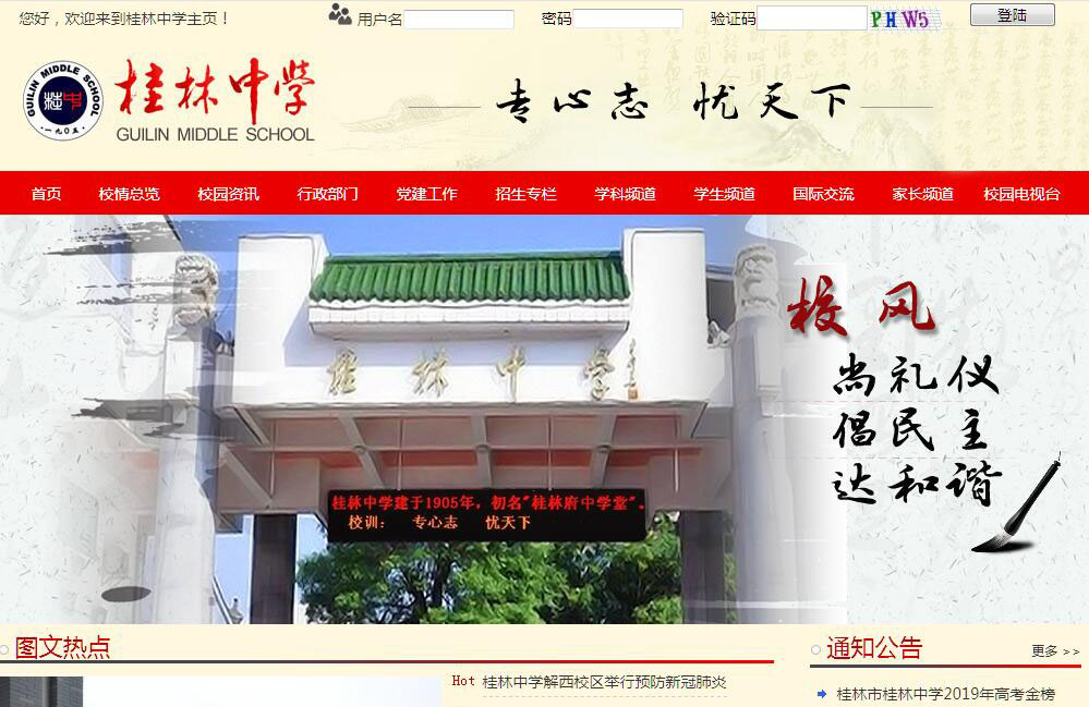 桂林中学是广西壮族自治区首批确定的重点中学和首批示范性普通高中,是桂林市首批对外开放学校。学校位于桂林市解放西路,占地面积49302平方米,校舍建筑面积25988平方米,现任校长马劲。桂林中学始建于1905年,初名“广西桂林府中学堂”,1912年更名为“广西桂林中学校”,其后,因学制更动,隶属关系变化和几校分合等原因,先后使用过“广西省立第三中学校”,“广西省立第三高级中学”,“广西省立桂林高级中学”,“广西省立桂林中学”,“桂林高中”,“广西省桂林中学”等名称,1959年改名为“桂林中学”,2004年更名为“桂林市桂林中学”。桂林中学以“专心志,忧天下”为校训,以“贯彻方针,全面育人”为办学理念,以“培养有素养的现代中国人”为育人目标,以“尚礼仪、倡民主、达和谐”为校风,以“重修身、善教化、勇创新”为教风,以“学主动、思深刻、志高远”为学风。学校在课程改革、校园文化建设等方面取得了丰硕成果,在自治区内外有重要影响,在全国重点高校之中有着良好的声誉。桂林中学荣获“全国德育先进校”“全国贯彻体育条例先进学校”“国家级语言文字规范化示范校”“广西(首批)示范学校”“广西普通高中课程改革样本学校”“广西卫生优秀学校”“广西中小学校园文化建设先进学校”等荣誉称号,学校办学业绩先后载入《中国教育年鉴》、《中国著名中学》、《中国名校》等中国教育典籍之中。桂林中学有着较长的办学历史,有良好的校风、教风和学风,有较高的教育教学质量。一百多年来,培养了50000余名毕业生。校友遍及海内外,他们中的杰出代表有中国科学院院士李林、雷啸霖、童庆禧、中国工程院院士黄旭华、“武侠小说之父”梁羽生、神5中国载人航天工程航天员系统总指挥兼总设计师宿双宁、现任中国人民解放军空军副司令员郑群良、现任公安部部长助理刘跃进、华为技术有限公司副总裁、首席法务官宋柳平、央视著名主持人欧阳夏丹等。桂林中学现有高中班31个,初中班6个,在校学生1900多人。教职工共158人,其中专任教师136人。教师中有:特级教师9人,高级教师70人,全国骨干教师4人,桂林市学科带头人和教学能手30人,已取得研究生学历或教育硕士学位32人。教师中取得高、中级职称者占总数的92%。近年,桂林中学打造以“知礼,知恩,知学,知法”为核心的课程体系,通过实施全方位的课程,渗透素质教育,不断深化教育改革。今年,按照市委市政府的“补齐教育短板,提升我市公办初中教学质量”的要求,在市教育局的领导下,在桂林市师范专科学校的大力支持下,借用师专信义校区恢复了桂林中学初中部招生,今年招收了初一新生300多名,在一定程度上缓解了桂林市区初中学位紧张的问题,今后桂林中学决心在市教育局的领导下,潜心钻研,为进一步提升教育教学质量作出自己应有的努力。