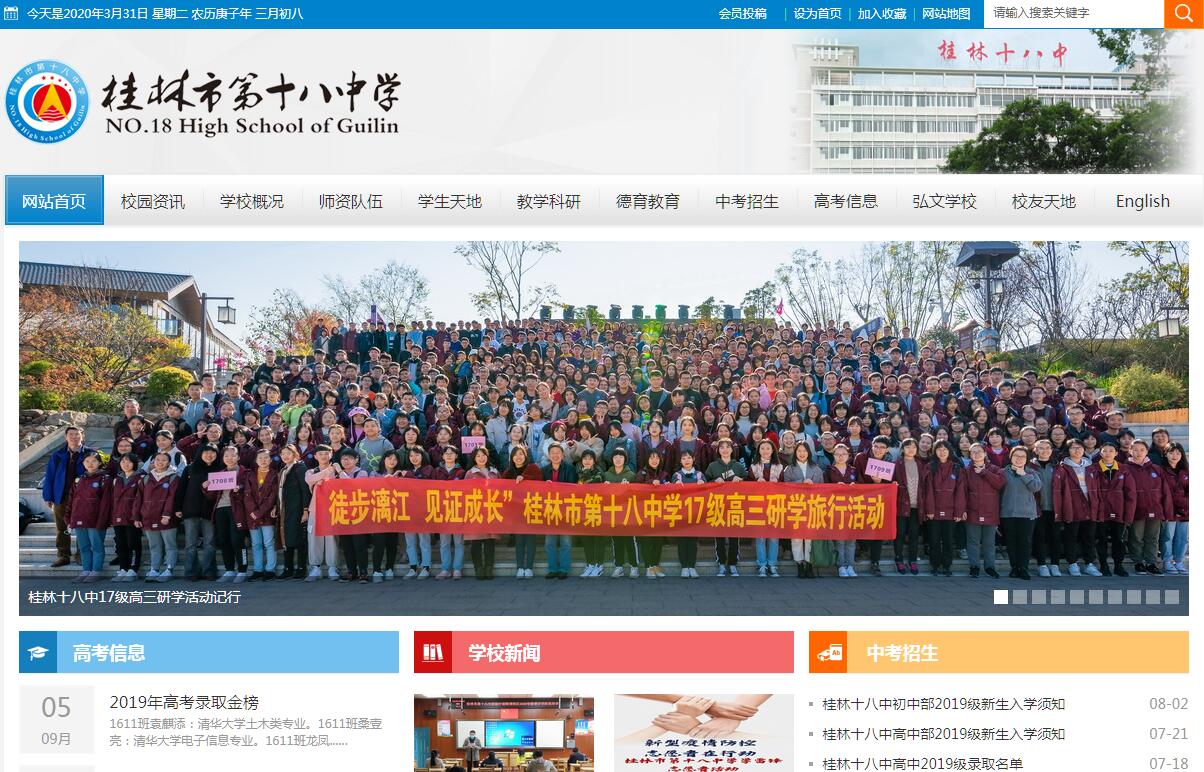 桂林十八中(原桂林地区高中)创建于1981年,是省级重点中学和广西首批示范性普通高中,是一所集八桂学子的刻苦、勤奋、求实、聪颖和灵气于一身的全寄宿制全国名校。学校位于桂磨黄金旅游通道旁,6路公交车在校门有上下站。学校占地140余亩,拥有400米标准塑胶跑道的足球场。四栋标准学生公寓楼(均配置有电话、电扇、洗漱卫生间,热水进宿舍);一栋二层可同时容纳1600人就餐的学生餐厅,每天供应40个以上不同品种且物美价廉的菜肴。学校有40多间标准教室(均配备有多媒体和空调)。七层建筑面积 8000 余平方米现代化综合科技大楼,有宽敞的阅览室和图书馆,理、化、生实验室及语音室设备先进。此外,学校还装备了光纤接入的高速宽带学生电子阅览室,全校拥有460多台教学用电脑。所有的消费均通过校园一卡通刷卡,安全快捷。学校环境优美,处处可见绿树、修竹、小桥、流水、红亭、蓝天,是一个“家园、学园、乐园、花园”式现代化学校。全校中青年教师占绝大多数,其中全国优秀教师3人,特级教师6人,广西骨干教师5人,高级教师56人,中级教师38人,中高级教师占85%,研究生14人,博士生1人,在读研究生23人。奥林匹克国家级高级教练3人,一级教练11人,广西奥林匹克竞赛优秀辅导员70人次,桂林市学科带头人10人,市教学能手20人。此外,我校还是广西首批获国家外专局批准具有聘请外国文教专家资格的中学,常年聘有外籍教师上英语课。教育教学、管理突出“以人为本”,“为了一切学生,为了学生的一切,一切为了学生”,“理性办学,文化立校”的办学理念,在大面积提高高考升学率的基础上,注重学生个性特长的发挥及创新能力、实践能力、终身学习能力和适应社会生活能力的培养。近五年来高考成绩突出,整体上线率一直稳居广西前五名。五年里,我校进入广西高考单科前十名的学生100余人,占大桂林市的近二分之一。奥林匹克学科竞赛成绩显著。近几年来,数学、物理、化学、生物、计算机信息学等奥赛居广西首位。