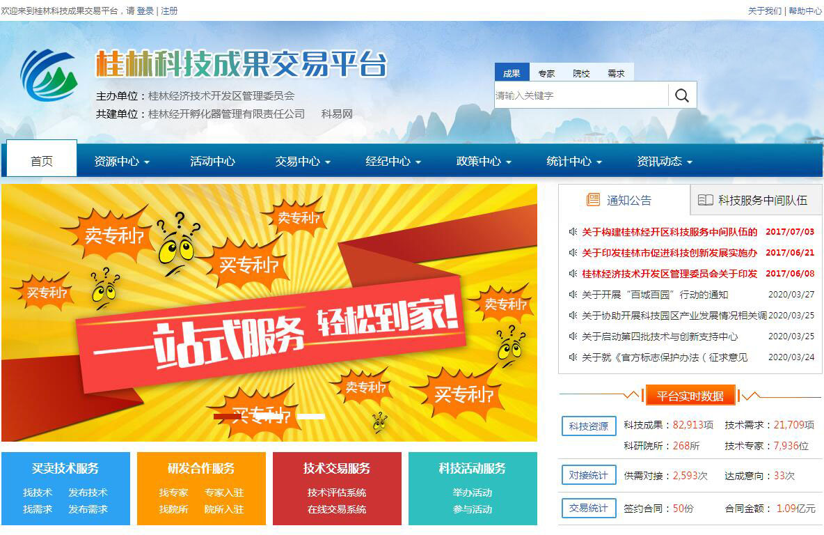 | 网站简介: 桂林科技成果交易平台是由桂林经开区主办,由科易网承接搭建的桂林经开区技术市场,集技术专利与科技服务交易的信息服务、对接服务、中介服务、交易服务为一体,构建了有效、可持续的桂林经开区科技平台。 |