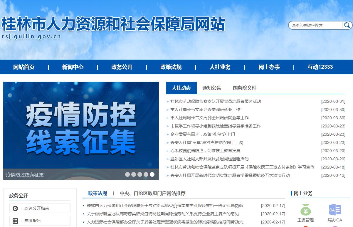 桂林市人力资源和社会保障局主要职责:(一)贯彻执行国家、自治区人力资源和社会保障事业的法律法规,拟订全市人力资源和社会保障事业发展规划、政策并组织实施,组织起草人力资源和社会保障工作相关地方性法规、政府规章草案,组织实施相关政策并监督检查。(二)拟订全市人力资源市场发展规划和人力资源服务业发展、人力资源流动政策,促进人力资源合理流动、有效配置。(三)负责全市促进就业工作,拟订统筹城乡的就业发展规划和措施,完善公共就业服务体系,统筹建立面向城乡劳动者的职业技能培训制度,落实就业援助制度,牵头落实高校毕业生就业政策。会同有关部门拟订高技能人才、农村实用人才培养和激励办法。(四)统筹推进建立覆盖全市城乡的多层次社会保障体系。按照国家和自治区关于城乡社会保险及其补充保险政策和标准,完善养老、工伤保险全市统筹办法,组织实施统一的养老、失业、工伤保险关系转续办法。组织拟订养老、失业、工伤等社会保险及其补充保险基金管理和监督制度,编制相关社会保险基金预决算草案,会同有关部门实施全民参保计划并建立全市统一的社会保险公共服务平台。(五)负责全市就业、失业、社会保险基金预测预警和信息引导,拟订应对预案,实施预防、调节和控制,保持就业形势稳定和社会保险基金总体收支平衡。(六)组织实施劳动人事争议调解仲裁制度和劳动关系政策,完善劳动关系协调机制,执行职工工作时间、休息休假和假期制度,执行消除非法使用童工和女工、未成年工的特殊劳动保护政策。组织实施劳动监察、协调劳动者工作,依法查处重大案件。(七)牵头推进深化职称制度改革,组织实施专业技术人员管理继续教育和博士后管理等政策,负责全市专业技术人才队伍、技能人才队伍建设,组织实施吸引留学人员来本桂林(回国)工作或定居办法。拟订技能人才培养、评价、使用和激励制度并组织实施。完善职业资格制度,健全职业技能多元化评价政策。(八)会同有关部门指导事业单位人员制度改革,按照管理权限负责规范事业单位岗位设置、公开招聘、聘用合同等人事综合管理工作,拟订事业单位工作人员和机关工勤人员管理政策。负责高层次专业技术人才选拔、引进和培养工作,负责桂林人才小高地管理工作。(九)会同有关部门承担全市表彰奖励、评比达标表彰工作及承办相关表彰奖励活动。(十)会同有关部门拟订事业单位人员工资收入分配政策,建立企事业单位人员工资决定、正常增长和支付保障机制。拟订企事业单位人员福利和离退休政策。(十一)会同有关部门推动农民工工作综合性措施和规划的落实,协调解决重点难点问题,维护农民工合法权益。(十二)拟订并完善人力资源和社会保障系统信访、维护稳定工作制度,会同有关部门协调处理重大信访事件或突发事件。(十三)承办市人民政府行政任免有关事项。负责审批全市事业单位科级以下干部(职工)因公出国(境)、赴港澳台政审及备案工作。(十四)完成市委、市政府交办的其他任务。