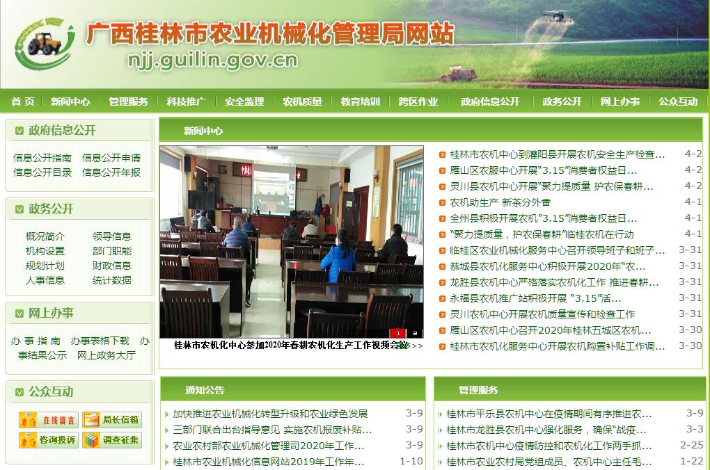| 网站简介: 桂林市农业机械化管理中心主要职责:一、坚决贯彻执行党和国家有关农业机械化的方针、政策和法规,贯彻落实市委、市政府有关农业机械化发展的精神,结合实际,围绕“三农”做好农业机械化工作;二、认真研究制定、组织实施全市农业机械化的区域规划、长远规划和年度计划,解决全市农业机械化发展中的重大问题。三、做好农业机械化重点科研项目的论证、申报和实施;做好农业机械化新技术的引进、开发、推广应用;引导农业机械化结构的调整与更新,提高农业机械化的普及和应用;四、做好农业机械化社会化服务体系建设和农机维修行业的管理及农业机械化统计信息工作,指导农业机械投入农业生产和抗灾救灾工作。五、贯彻落实农业机械购置补贴政策、做好农业机械购置补贴资金监督、管理工作;六、做好拖拉机、联合收割机等农业机械的安全监理工作;七、做好农机系统的财务管理工作以及监督和指导对重大农业机械化项目资金和其它专项资金的使用。八、做好农业机械化实用技术和驾驶操作等各类人员的培训与管理工作。九、承办好市人民政府和上级业务主管部门交办的其它工作。 |