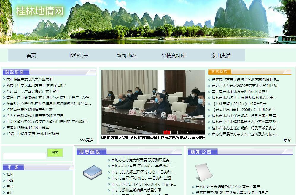 | 网站简介: 桂林地情网由桂林市地方志编纂委员会办公室主办。桂林市地方志编纂委员会办公室主要职责:(一)贯彻执行国家、自治区、桂林市有关地方志工作法律、法规和政策。(二)协助拟定全市地方志事业发展规划和地方志编纂工作方案。(三)负责编纂本级地方志书、地方综合年鉴及地方史,指导全市地方志书、地方综合年鉴及地方史的编纂工作。(四)收集保护整理地方志文献和旧志资料,推动地方志资料年报工作。(五)组织开展地情资源开发,推动地方志理论研究。(六)推进地情信息化建设。(七)完成主管部门交办的其他任务。 |