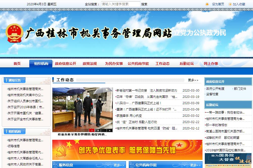 桂林市机关事务管理局贯彻落实党中央、自治区党委、市委关于机关事务工作的方针政策和决策部署,在履行职责过程中坚持和加强党对机关事务工作的集中统一领导。其主要职责是:(一)贯彻执行国家有关机关事务工作的政策法规,拟订全市机关事务工作的政策、规划和规章制度并组织实施。会同有关部门拟订全市机关事业单位后勤体制改革的政策、制度并组织实施。指导全市各级行政事业单位的机关事务工作。(二)负责市直属党政机关房地产管理工作,制定相关规章制度并组织实施。负责办公用房的规划、建设、权属、调剂、使用监管、处置和维修等。负责市直机关公共租赁住房、集中周转住房以及政府集中管理宿舍区的规划改造、建设监管、调配管理和所有权及相应土地使用权登记工作。负责市直属单位政策性住房的调配及保障管理工作。(三)协助有关部门做好市直机关住房资金、住房公积金的管理工作。(四)指导全市党政机关公务用车管理工作,会同有关部门推进全市党政机关公务用车制度改革工作。负责市直机关公务用车的编制、配备、更新、处置工作。负责市本级党政群机关、参公事业单位应急、机要通信等公务用车的日常管理工作。(五)负责全市公共机构节能推进、指导、协调、监督工作。会同有关部门制订全市公共机构节能管理的规划、制度并组织实施,监督管理市本级公共机构节能工作。承办市公共机构节能工作领导小组的日常工作。(六)按照国家有关政策,管理市直机关国有资产,制定相关具体制度和办法,承担产权界定、清查登记、资产处置工作。(七)负责市直机关的卫生保健服务管理工作,优化市直机关卫生健康资源配置。(八)参与市委、市人大、市政府、市政协召开重要会议、举办重要活动的总务工作。(九)负责中央、自治区安排到桂林挂职、交流的市领导(家不在桂林)及市委、市人大、市政府、市政协离退休老干部有关生活服务保障工作。(十)负责市委、市人大、市政府、市政协机关办公区、宿舍区的安全保卫和消防及市直机关集体户口的管理工作。(十一)完成市委、市政府交办的其他任务。