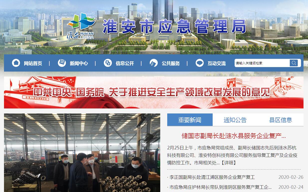 淮安市应急管理局主要职责:(一)负责应急管理工作,指导全市各级各部门应对安全生产类、自然灾害类等突发事件和综合防灾减灾救灾工作。负责安全生产综合监督管理和工矿商贸行业安全生产监督管理工作。(二)拟订应急管理、安全生产等政策规定,组织编制市应急体系建设、安全生产和综合防灾减灾规划,起草相关政策规定,组织制定相关规程、标准并监督实施。(三)指导应急预案体系建设,建立完善事故灾难和自然灾害分级应对制度,组织编制市总体应急预案和安全生产类、自然灾害类专项预案,综合协调应急预案衔接工作,组织开展预案演练,推动应急避难设施建设。(四)牵头建立统一的应急管理信息系统,负责信息传输渠道的规划和布局,建立监测预警和灾情报告制度,健全自然灾害信息资源获取和共享机制,依法统一发布灾情。(五)组织指导协调安全生产类、自然灾害类等突发事件应急救援,承担市应对重大灾害指挥部工作,综合研判突发事件发展态势并提出应对建议,协助市委、市政府指定的负责同志组织重大灾害应急处置工作。(六)统一协调指挥各类应急专业队伍,建立应急协调联动机制,推进指挥平台对接。提请、衔接解放军和武警部队参与应急救援工作。(七)统筹应急救援力量建设,负责消防、森林火灾扑敕、抗洪抢险、地震和地质灾害救援、生产安全事故救援等专业应急救援力量建设。指导综合性应急救援队伍、各级各部门及社会应急救援力量建设。(八)负责消防管理工作,指导全市各级消防监督、火灾预防、火灾扑救等工作。(九)指导协调森林火灾、水旱灾害、地震和地质灾害等防治工作,负责自然灾害综合监测预警工作,指导开展自然灾害综合风险评估工作。(十)组织协调灾害救助工作。组织指导灾情核查、损失评估、救灾捐赠工作,管理、分配上级下拨和市级救灾款物并监督使用。(十一)依法行使市安全生产综合监督管理职权,指导协调、监督检查市政府有关部门和各县区政府的安全生产工作。组织开展安全生产巡查、考核工作。(十二)按照分级、属地原则,依法监督检查工矿商贸生产经营单位贯彻执行安全生产法律法规情况及其安全生产条件和有关设备(特种设备除外)、材料、劳动防护用品的安全生产管理工作。依法组织并指导监督实施安全生产准入制度。负责危险化学品安全监督管理综合工作和烟花爆竹安全生产监督管理工作。(十三)依法组织指导实施生产安全事故调查处理,监督事故查处和责任追究落实情况。组织开展自然灾害类突发事件的调查评估工作。(十四)开展应急管理、安全生产等方面的对外交流与合作,组织参与安全生产类、自然灾害类等突发事件的跨区域救援工作。(十五)制定应急物资储备和应急救援装备规划并组织实施,会同市发展和改革委员会〔市粮食和物资储备局)等部门建立健全应急物资信息平台和调拨制度,在救灾时统一调度。(十六)负责应急管理、安全生产、防灾减灾宣传教育和培训工作,组织指导相关科学技术研究、推广应用和信息化建设工作。(十七)完成市委、市政府交办的其他任务。