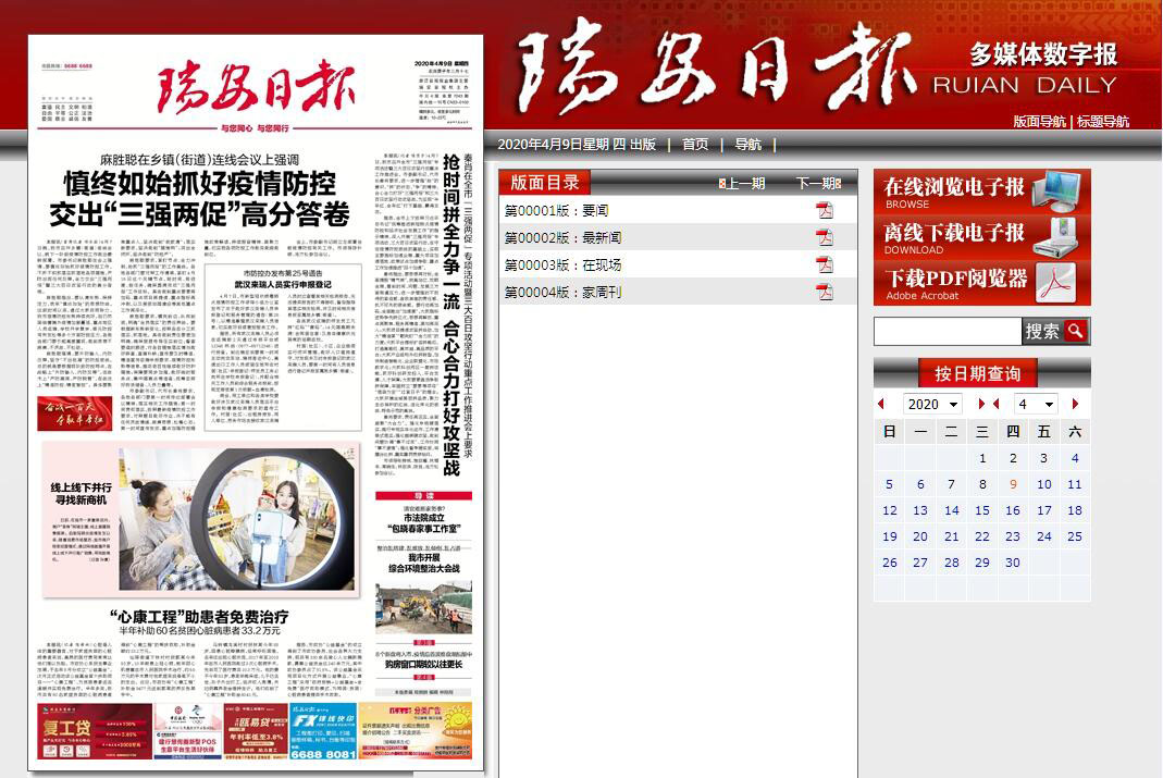 | 网站简介: 瑞安日报电子版,瑞安日报多媒体数字报刊平台。瑞安报于1956年创刊,后因故于1961年停刊;1993年7月复刊,2001年1月更名为瑞安日报。2004年1月,加盟浙报集团;2004年12月,瑞安日报有限公司挂牌成立。2006年12月,数字报开通;2008年7月,瑞安报网开通;2011年6月,承办瑞安新闻网。报纸现为全彩周六报,每周出刊88版。报社现有在职员工77人,其中在编职工41人,聘用职工36人;内设7个中层机构:总编办、新闻中心、新媒体中心、用户中心、地方新闻中心、考绩办、财务室。瑞安日报社坚持从加快融合、科学发展的要求出发,主动应对县市报发展的新形势,从当前定位到长远发展,从版面改革到版外拓展,从架构突破到机制创新,克难攻坚,大胆探索,求真务实,勇于实践,积极打造新闻精品,发展多种媒体系列平台,在推进传统媒体与新兴媒体融合发展中不断发展壮大。 |