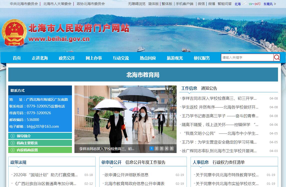 北海市教育局是市政府工作部门,为正处级。市委教育工作领导小组是市委议事协调机构,市委教育工作领导小组办公室设在市教育局。北海市教育局贯彻党中央、自治区党委和市委关于教育工作的方针政策和决策部署,在履行职责过程中坚持和加强党对教育工作的全面领导。其主要职责是:(一)贯彻执行教育工作法律、法规,中央、自治区党委和市委关于教育工作的决策部署。拟订全市教育改革与发展的改革与发展的政策和规划,组织实施有关教育工作政策法规。(二)负责指导全市教育系统党的建设、理论宣传、统一战线和共青团工作。指导全市中小学、幼儿园和中等职业技术学校的思想政治、德育、智育、体育卫生与艺术、劳动教育、国防教育、安全稳定工作。(三)负责推进全市教育现代化的有关工作。负责全市各级各类教育的统筹规划和协调管理,指导中小学、幼儿园和中等职业技术学校做好规划建设和教育教学改革,负责全市教育信息的统计、分析和发布。(四)负责教育经费的统筹管理,参与拟订教育经费筹措、 教育拨款、学生资助、教育基建投资的政策,负责统计全市教育经费投入情况。(五)负责基础教育的改革与发展工作。负责推进义务教育均衡发展和促进教育公平,负责义务教育的宏观指导与协调,指导普通高中教育、学前教育和特殊教育工作。制定基础教育教学基本要求,参与审定基础教育地方课程教材,审定中小学用书目录,全面实施素质教育。(六)负责职业教育的改革与发展工作。组织开展职业教育评估。指导县(区)和有关部门做好职业教育学校布局和专业结构调整等工作,指导职业教育教材建设和就业指导工作。(七)负责全市高等教育的协调服务工作。(八)负责少数民族教育工作。统筹协调对少数民族的教育援助。(九)负责全市教师工作,组织实施教师资格制度,指导教育系统人才队伍建设。(十)负责各类中等职业教育招生考试和学籍学历管理工作,组织拟订中等职业教育招生计划并组织实施。(十一)负责全市语言文字工作,拟订全市语言文字工作的规划和计划,指导语言文字规范化工作,监督检查语言文字的应用情况。指导推广普通话工作和普通话师资培训工作。(十二)负责全市教育系统对外合作与交流工作。参与汉语国际推广工作。统筹管理并指导与港澳台地区的教育合作与交流工作。协助管理教育系统来市外籍教师、专家工作。(十三)负责全市教育信息化工作。拟订全市教育系统信息化规划和计划并组织实施。(十四)负责全市民办教育的统筹规划、综合协调和宏观管理。完善民办教育管理的政策措施,依法制定全市民办教育发展的政策与规划,规范办学秩序,促进民办教育事业健康发展。(十五)指导全市教育督导工作。受市人民政府委托,负责对县(区)人民政府及有关职能部门履行教育工作职责情况的督导检查。依法组织实施对各级各类教育的督导评估、检查验收、质量监测等工作。(十六)承担市招生考试委员会、市高等教育自学考试委员会的日常工作。(十七)完成市委、市人民政府交办的其他任务。