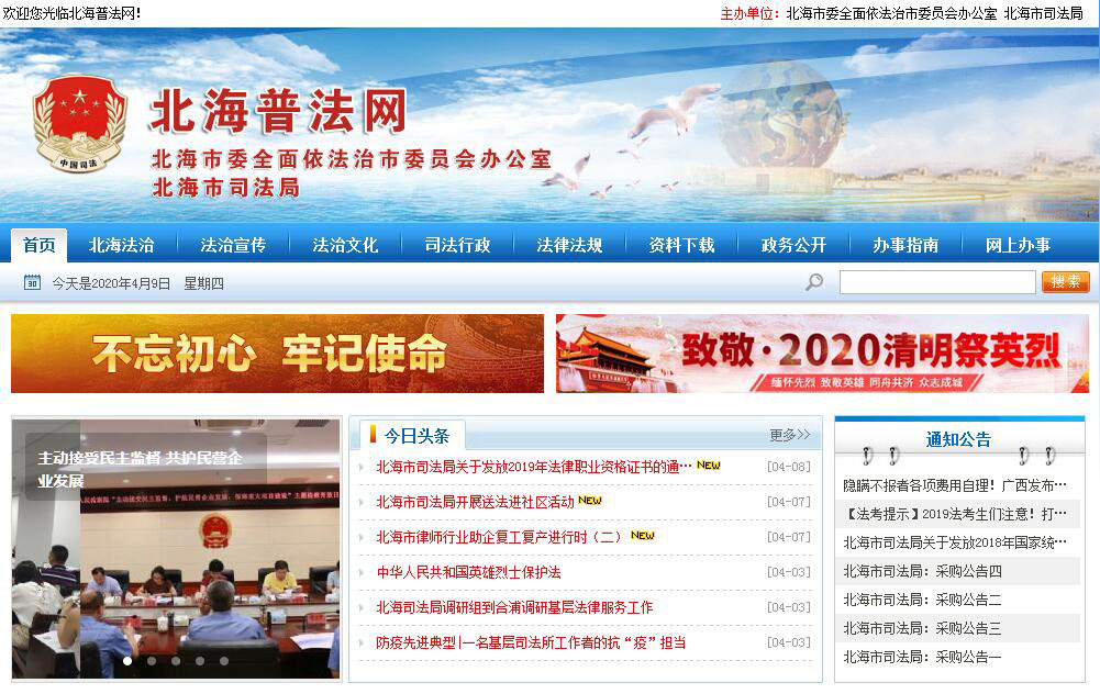 北海普法网由北海市委全面依法治市委员会办公室、北海市司法局主办。北海市司法局负责贯彻落实党中央关于全面依法治国、自治区党委关于全面依法治区和北海市委关于全面依法治市的方针政策和决策部署,在履行职责过程中坚持和加强党对全面依法治市的集中统一领导。其主要职责是:(一)贯彻执行国家司法行政工作的方针、政策和法律、法规,制定全市司法行政工作的发展规划并组织实施。(二)承担全面依法治市重大问题的政策研究,协调有关方面提出全面依法治市中长期规划建议,负责有关重大决策部署督察工作。(三)承担统筹规划立法工作的责任。(四)负责起草或者组织起草有关地方性法规、政府规章草案。(五)承办市人民政府规章的立法解释、立法后评估工作。(六)负责对市人民政府拟出台的规范性文件以及需要市人民政府批准的市直部门规范性文件的合法性审查。(七)承担统筹推进法治政府建设的责任。(八)承办向市人民政府申请的行政复议、行政赔偿案件。(九)承担统筹规划全市法治社会建设的责任。(十)负责指导、管理社区矫正工作。指导刑满释放人员帮教安置工作。(十一)对社区戒毒和社区康复工作提供指导、支持和协助。(十二)负责拟订公共法律服务体系建设规划并指导实施,统筹和布局城乡、区域法律服务资源。(十三)负责全市国家统一法律职业资格考试的组织实施工作。(十四)负责北海市法治对外合作工作。(十五)负责全市司法行政系统警用物资装备管理工作。(十六)规划、协调、指导法治人才队伍建设相关工作,指导、监督本系统队伍建设。(十七)完成北海市委、市政府交办的其他任务。