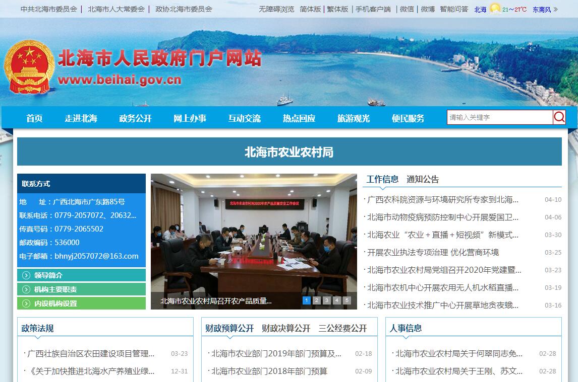 北海市农业农村局贯彻落实党中央、自治区党委、市委关于“三农”工作的方针政策和决策部署,在履行职责过程中坚持和加强党对“三农”工作的集中统一领导。其主要职责是:(一)研究并组织实施全市“三农”工作的发展战略、中长期规划、重大政策、重大举措。组织开展全市农业农村改革发展重大问题的调查研究。(二)提出涉农的财税、价格、收储、金融保险、进出口等政策建议,负责起草有关地方性规章草案和规范性文件。参与农业行政执法体系建设,组织实施全市农业综合执法。(三)统筹推动发展全市农村社会事业、农村公共服务、农村文化、农村基础设施和乡村治理。协调推进改善农村人居环境。指导农村精神文明和优秀农耕文化建设。指导农业行业安全生产工作。(四)组织实施深化农村经济体制改革和巩固完善农村基本经营制度的政策。负责农民承包地、农村宅基地改革和管理有关工作。牵头负责农村集体产权制度改革,指导农村集体经济组织发展和集体资产管理工作。指导农民合作经济组织、农业社会化服务体系、新型农业经营主体建设与发展。指导农村有关改革试验区建设和美丽乡村建设。(五)指导全市乡村特色产业、农产品加工业、休闲农业发展工作。提出促进大宗农产品流通的建议,培育、保护农业品牌。发布农业农村经济信息,监测分析农业农村经济运行。承担农业大数据、农业统计和农业农村信息化有关工作。归口管理农业农村相关对外宣传及信息发布工作。(六)负责全市种植业、畜牧业、渔业、农业机械化等农业各产业的监督管理。指导全市农产品生产。组织构建现代农业产业体系、生产体系、经营体系,指导农业标准化生产。监督管理全市渔业和渔政渔港,参与国家渔业维权护渔。(七)监督管理全市农产品质量安全。组织开展农产品质量安全监测、追溯、风险评估。会同有关部门组织实施农产品质量安全国家标准和自治区特色农产品安全标准。参与制订农产品质量安全地方标准并会同有关部门组织实施。指导全市农业检验检测体系建设。(八)组织全市农业资源综合区划与开发利用。指导农用地、渔业水域以及农业生物物种资源的保护与管理,负责水生野生动植物保护、耕地及永久基本农田质量保护工作。指导市农产品产地环境管理和农业清洁生产。指导设施农业、生态循环农业、节水农业发展以及农村可再生能源综合开发利用、农业生物质产业发展。牵头管理外来物种。(九)监督管理全市主要农业生产资料和农业投入品。指导农业生产资料市场体系建设。组织兽医医政、兽药药政药检工作,负责执业兽医和畜禽屠宰行业管理。(十)负责全市农业防灾减灾、农作物重大病虫害防治工作。指导动植物防疫检疫体系建设,组织、监督市内动植物防疫检疫,发布疫情并组织扑灭。(十一)负责全市农业投资管理。提出农业投融资体制机制改革建议。组织编制全市农业投资建设规划,提出农业投资规模和方向、扶持农业农村发展财政项目的建议,承担中央、自治区农业投资建设项目,参与农业投资项目资金安排和监督管理。(十二)推动全市农业科技体制改革和农业科技创新体系建设。指导农业产业技术体系和农技推广体系建设,组织开展农业领域的科学研究、成果转化和技术推广。负责农业转基因生物生产加工安全监督管理和农业植物新品种保护。(十三)指导全市农业农村人才工作。拟订农业农村人才队伍建设规划、计划并组织实施,指导农业教育和农业职业技能开发,指导新型职业农民培育、农业科技人才培养和农村实用人才培训工作。(十四)组织开展农业对外交流合作。拟定全市农业对外开放的发展规划和对策。承办农业涉外事务,组织农业贸易促进和有关技术交流与合作。贯彻落实国家、自治区农业对外援助政策,组织实施有关农业援外及援市项目。(十五)完成市委、市人民政府交办的其他任务。