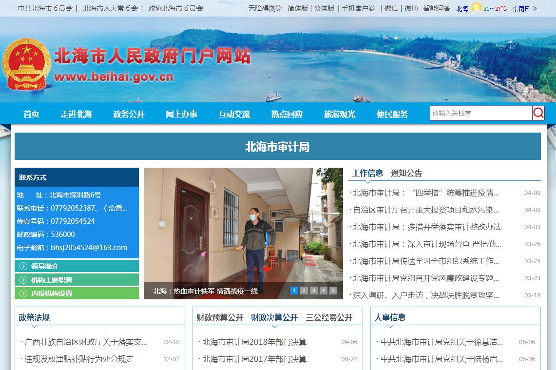 北海市审计局主要职责:(一)主管全市审计工作。负责对国家、自治区、市财政收支和法律法规规定属于审计监督范围的财务收支的真实、合法和效益进行审计监督,对公共资金、国有资产、国有资源和领导干部履行经济责任情况实行审计全覆盖,对领导干部实行自然资源资产离任审计,对国家、自治区重大政策措施贯彻落实情况进行跟踪审计。对审计、专项审计调查和核查社会审计机构相关审计报告的结果承担责任,并负有督促被审计单位整改的责任。(二)受市政府委托,起草有关全市审计的地方性法规、地方政府规章草案,拟订全市审计政策,制定全市有关审计指南并监督执行。制定并组织实施专业领域审计工作规划。参与起草财政经济及其相关地方性法规、地方政府规章草案。对直接审计、调查和核查的事项依法进行审计评价,作出审计决定或提出审计建议。(三)向市委审计委员会提出年度预算执行和其他财政收支情况审计情况报告。向市长提出年度预算执行和其他财政收支情况审计结果报告。受市人民政府委托向市人大常委会提出市本级预算执行和其他财政收支情况的审计工作报告、审计查出问题整改情况报告。向市委、市人民政府报告对其他事项的审计和专项审计调查情况及结果。依法向社会公布审计结果。向市委和市人民政府有关部门、各县(区)党委和人民政府通报审计情况和审计结果。(四)直接审计下列事项,出具审计报告,在法定职权范围内作出审计决定。包括:国家、自治区和市有关重大政策措施贯彻落实情况;市本级预算执行情况和其他财政收支,市本级各机关各部门(含直属单位)预算执行情况、决算草案和其他财政收支;县(区)人民政府预算执行情况、决算草案和其他财政收支,中央、自治区和市本级财政转移支付资金;使用市财政资金的事业单位和社会团体的财务收支;市人民政府投资和以市人民政府投资为主的建设项目的预算执行情况和决算,市重大公共工程项目的资金管理使用和建设运营情况;自然资源管理、污染防治和生态保护与修复情况;市国有企业和金融机构、市国有资本占控股或主导地位的企业和金融机构境内外资产、负债和损益,市驻外非经营性机构的财务收支;有关社会保障基金、社会捐赠资金和其他基金、资金的财务收支;国际组织和外国政府援助、贷款项目;法律法规规定的其他事项。(五)按规定对市委管理的党政主要领导干部及其他单位主要负责人实施经济责任审计和自然资源资产离任审计。(六)组织实施对国家财经法律、法规、规章、政策和宏观调控措施执行情况、财政预算管理及国有资产管理使用等与国家财政收支有关的特定审计事项进行专项审计调查。(七)依法检查审计决定执行情况,督促整改审计查出的问题,依法办理被审计单位对审计决定提请行政复议、行政诉讼或市人民政府裁决中的有关事项,协助配合有关部门查处相关重大案件。(八)指导和监督全市内部审计工作,核查社会审计机构对依法属于审计监督对象的单位出具的相关审计报告。(九)与县(区)党委和人民政府共同领导县(区)审计机关。依法领导和监督各县(区)审计机关的业务,组织实施特定项目的专项审计或审计调查,纠正或责成纠正各县(区)审计机关违反国家规定作出的审计决定。按照干部管理权限共同管理县(区)审计机关领导班子成员。(十)组织开展审计领域的市内外交流与合作,指导和推广信息技术在审计领域的应用。(十一)完成市委、市人民政府交办的其他任务。
