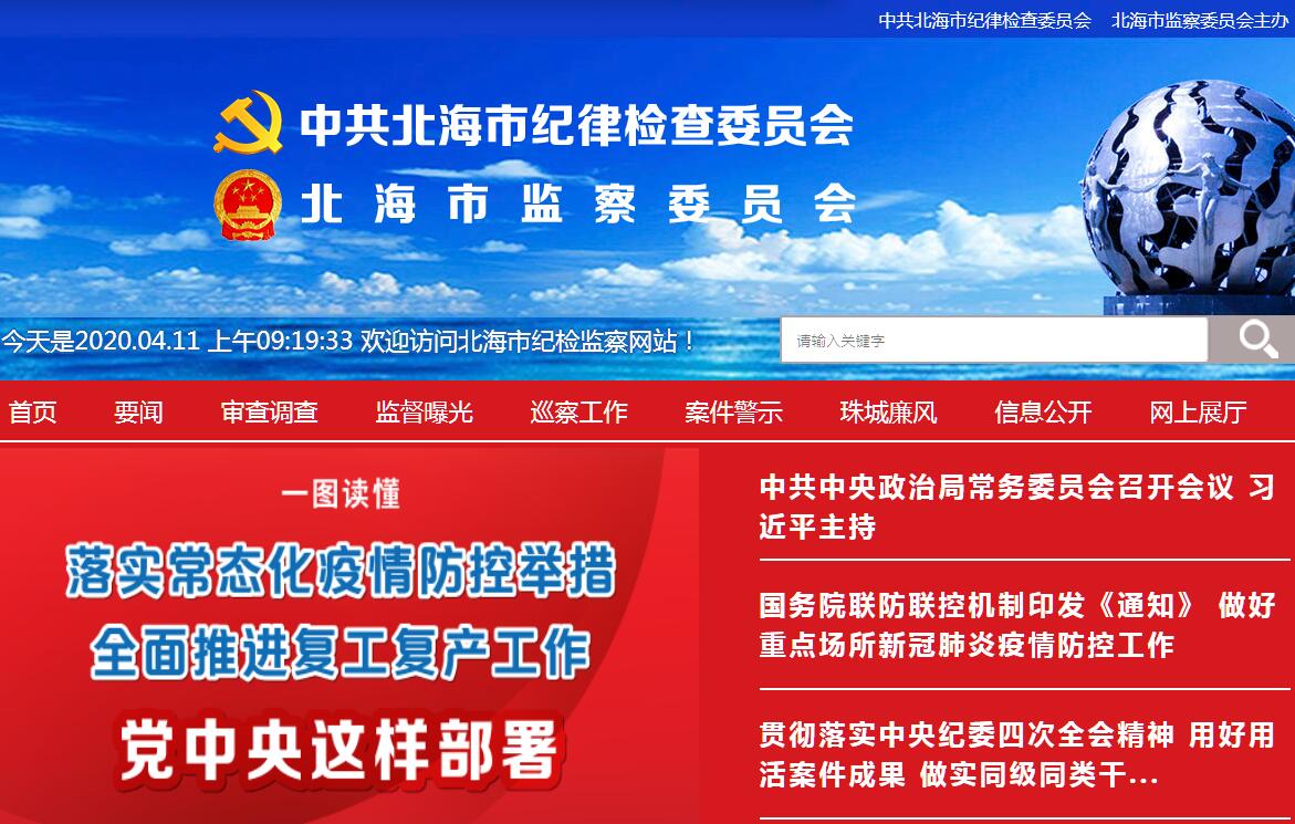 北海市纪检监察网由中共北海市纪律检查委员会、北海市监察委员会主办。北海市纪检监察部门的主要职责为:(一)负责党的纪律检查工作;依照党的章程和其他党内法规履行监督、执纪、问责职责;负责全市监察工作;依照法律规定履行监督、调查、处置职责;负责组织协调全面从严治党、党风廉政建设和反腐败宣传教育工作;负责综合分析全面从严治党、党风廉政建设和反腐败工作情况,对纪检监察工作重要理论及实践问题进行调查研究等;根据干部管理权限,负责全市纪检监察系统领导班子建设、干部队伍建设和组织建设的综合规划、政策研究、制度建设和业务指导等;完成自治区纪委监委、市委交办的其他任务。(二)根据经济社会发展不同时期的工作重点,修订和完善绩效考评指标和考评办法;审定考评对象根据职能任务和工作要求制定的年度绩效计划;督促考评对象绩效目标完成情况,提出改进意见和建议,对县(区)和市直属机关进行年度绩效考评工作。(三)负责反腐倡廉建设电化教育工作;编辑制作反腐倡廉专题教育教材;建立、管理纪检监察机关内部网站、互联网站,开展反腐倡廉网络宣传工作;负责纪检监察网上举报信息收集,反腐倡廉网络舆情信息监控、收集、研判和处置工作。(四)负责我市绩效管理研究、综合考评、社会评价和绩效评估的日常具体工作;承担综合绩效考评数据的采集、统计、分析和绩效信息平台建设与管理。