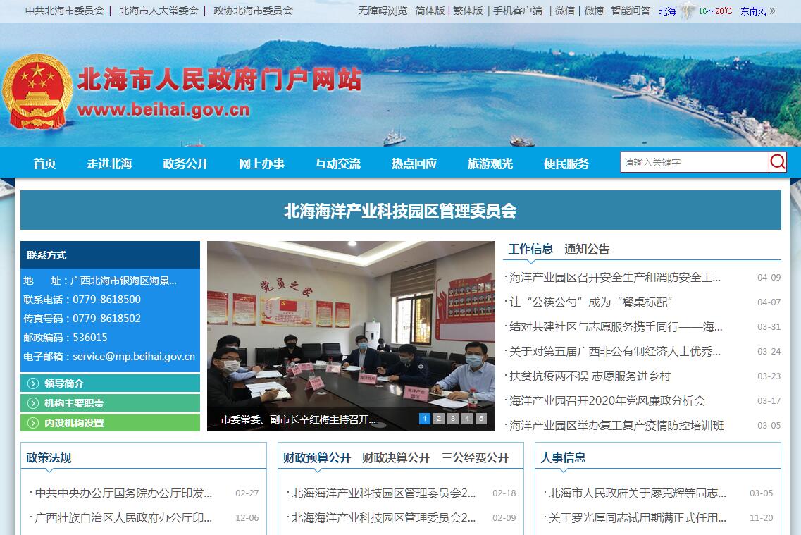 广西北海国家(海洋)农业科技园区管理委员会为北海市人民政府派出机构,增挂北海市海洋产业科技园区管理委员会牌子,其主要职责是:1、区域内经济发展和建设规划、产业政策、管理办法和优惠政策,按程序报市人民政府批准后组织实施。2、负责区域内经济发展工作,抓好招商引资、产业培育、产业发展布局等工作;负责经贸管理、安全生产、环境保护等工作,按权限审批、审核投资项目。3、负责区域内财政、国有资产管理、投融资等工作。4、负责广西北海国家(海洋)农业科技园区暨北海海洋产业科技园区开发建设和管理工作。 5、负责区域内城市建设、市政管理、土地管理、规划管理、海域管理等工作;负责区域内城乡规划实施的监督管理,组织检查城乡规划的执行情况,依法查处城乡规划违法违规行为;负责依法查处国土资源违法案件等工作。负责依法维护区域内的海洋权益,依法进行海域使用的监督管理,依法查处违法行为。6、负责协调和管理有关部门设在区域内的分支机构或派驻机构。7、负责区域内企业、科研机构的公共服务以及项目建设的组织、协调和管理工作。8、负责区域内科技项目的组织实施、技术成果推广应用以及技术培训和合作交流。9、负责区域内科技创新体系、信息网络的建设。10、行使市人民政府、辖区人民政府授予的其他职权。