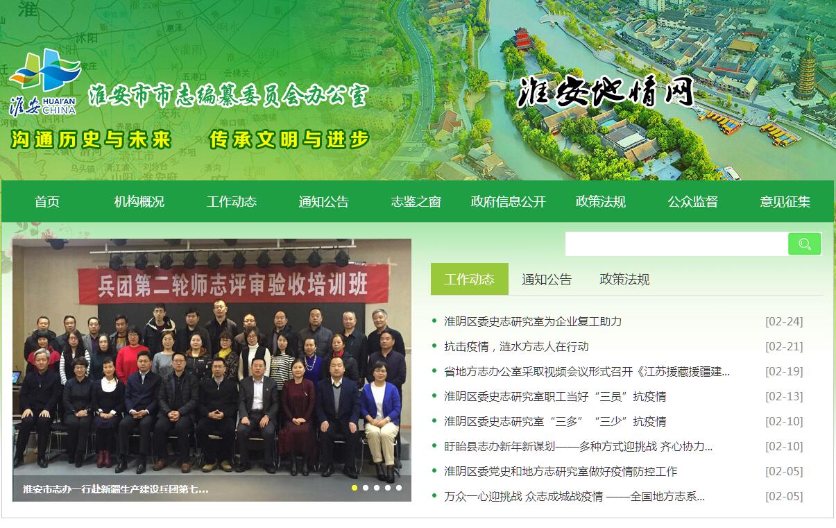 | 网站简介: 淮安市地方志办公室(淮安市市志办)全称为淮安市市志编纂委员会办公室,成立于1986年,现为市政府直属参照管理事业单位。淮安市市志办致力于淮安地方志、年鉴编纂出版,旧志整理,运河文化研究等工作,截止2015年底,先后出版《淮阴市志》《洪泽湖志》等地情书籍20余种,连续出版《淮安年鉴》21卷,点校整理旧志文献19种,单位数次被评为全国和全省方志系统先进集体,成果多次在国家级、省级评比中获奖。目前,淮安市市志办下设有秘书处、方志处、年鉴处,以及大运河文化研究中心办公室。淮安市地方志办公室是市政府直属参照管理事业单位。主要履行下列职责:一、组织、指导、督促和检查全市地方志工作;二、拟定全市地方志工作规划和编纂方案;三、组织编纂《淮安市志》、《淮安年鉴》;四、搜集、保存地方志文献和资料,组织整理旧志,推动方志理论研究;五、组织开发利用地方志资源;六、负责地情研究、宣传工作;七、负责承办省地方志办公室下达的各项任务;八、为领导决策和涉及全市社会经济发展的相关内容提供历史性、可行性与前瞻性论证和咨询服务,并逐步向全社会提供多方面的地方信息服务。承办市委、市政府交办的其他事项。 |