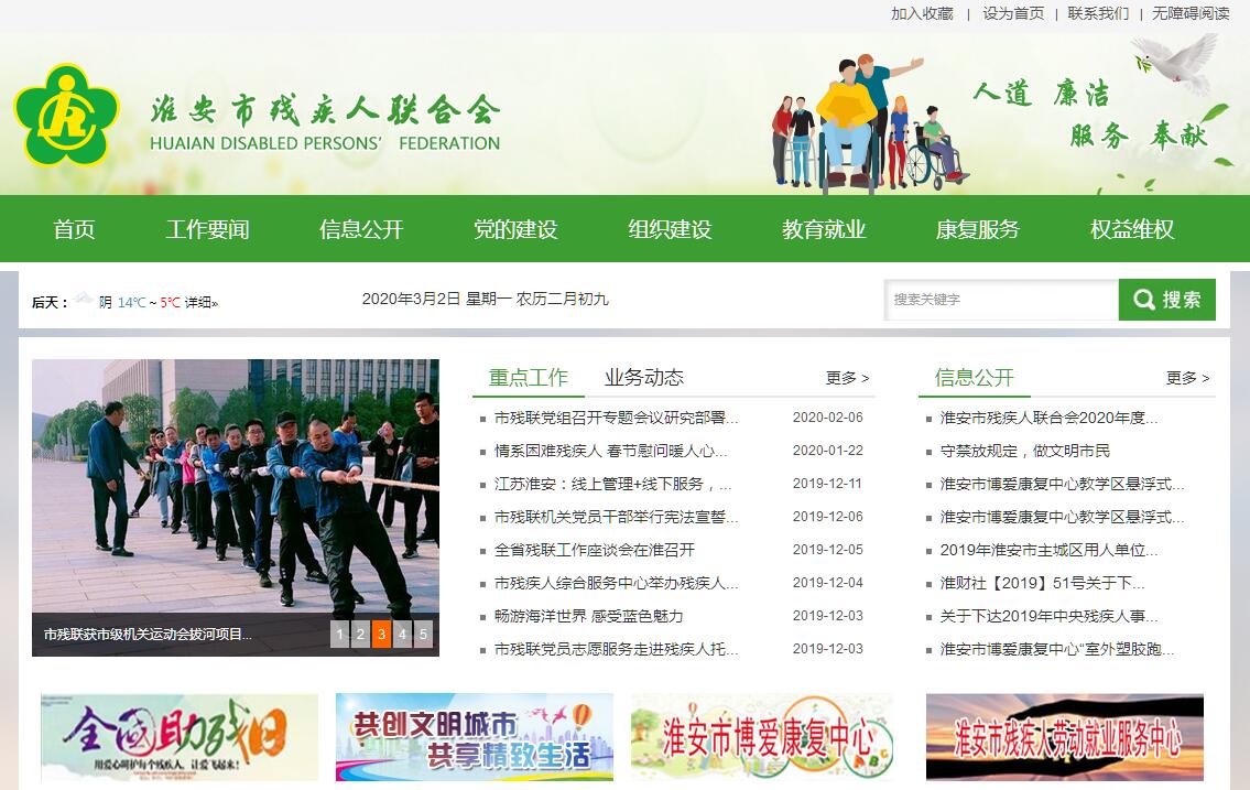 淮安市残联是中国残疾人联合会的地方组织,是将残疾人自身代表组织、社会福利团体和事业管理机构融为一体的残疾人人民团体,具有“代表、服务、管理”职能;代表残疾人共同利益、维护残疾人合法权益;开展各项业务活动,直接为残疾人服务;承担政府委托的部分行政职能,发展和管理残疾人事业。其机关主要职能是:(一)听取残疾人意见,反映残疾人需求,维护残疾人合法权益,为残疾人服务。(二)团结、教育残疾人遵守法律,履行应尽的义务,发扬乐观进展精神,自尊、自信、自强、自立,为社会主义建设贡献力量。(三)弘扬人道主义,宣传残疾人事业,沟通政府、社会与残疾人之间的联系,动员社会理解、尊重、关心、帮助残疾人。(四)开展残疾人康复、教育、劳动就业、扶贫、文化、体育、用品供应、福利、社会服务、无障碍设施和残疾预防等工作,创造良好的环境和条件,扶助残疾人平等参与社会生活。(五)协助政府研究、制定和实施残疾人事业的法规、政策、规范和计划,对有关业务领域进行指导和管理。(六)承担市政府残疾人工作协调委员会的日常工作,做好综合、组织、协调和服务。(七)开展残疾人事业的交流和合作。(八)负责对各类残疾人社会团体组织进行监督管理。(九)承担市委、市政府交办的其他工作。