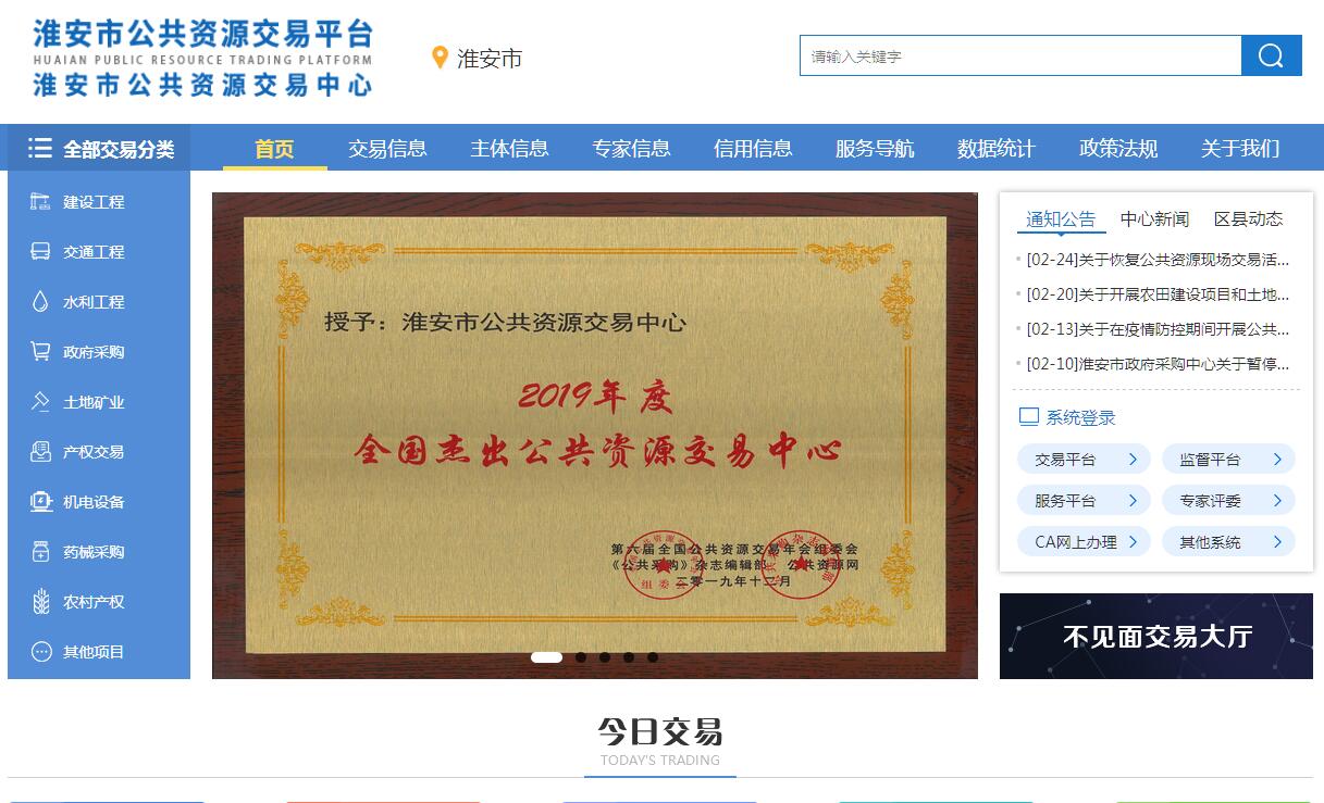 淮安市公共资源交易中心经淮安市人民政府批准,于2014年5月6日正式成立,为全额拨款副处级事业单位,由我市原政府采购中心、土地交易中心、建设工程交易中心、产权交易中心、药品器械采购服务中心、机电设备交易中心等6家中心整合组建,接受市政务服务管理办公室(市公共资源交易监督管理办公室)的日常监督和管理。内设综合事务部、交易受理部、文本制作一部(政府采购部)、文本制作二部(产权[土地]药械交易部)、交易组织评审部、审核督查部、信息化部和重大项目部。2016年4月,根据《淮安市整合建立统一的公共资源交易平台实施方案》(淮办发〔2016〕38号)和《关于设立市公共资源交易中心县区分中心的通知》(淮编办发〔2016〕49号),淮安市县级公共资源交易中心全部调整为市公共资源交易中心县区分中心。2016年5月24日,淮安市公共资源交易中心各县区分中心正式挂牌运转。交易中心主要承担为全市公共资源交易活动提供场所、信息、咨询、见证等相关服务工作,依法组织开展政府采购、产权交易、土地交易等业务工作。具体工作职责如下:1、负责中心的建设、运营和管理;2、为公共资源交易市场主体、公众、各类监督和管理部门提供公共资源交易活动和监管场所;3、负责提供公共资源交易信息、咨询、验证等相关公共服务工作,承担交易登记、信息发布、专家抽取、平台秩序管理、进场条件验证、公共资源交易过程见证、交易结果鉴证、保证金管理、档案管理等服务工作,为综合监管部门和有关行政监督部门提供监管条件;4、负责进入中心交易项目的业务操作,包括政府集中采购、公立医院药品医用耗材与医用设备采购等业务代理工作,以及依法组织开展产权交易、土地交易等业务活动;5、负责公共资源交易综合专家抽取系统建设,负责公共资源电子交易等各类信息平台的建设、运营和管理,负责指导和协助建设单位、中介代理机构进行专家抽取;6、负责评标专家出勤情况的记录;7、负责建立进入公共资源交易中心交易的主体信息数据库以及信用档案;8、负责交易信息数据统计,按月报送综合监管部门,并抄送相关部门或机构。