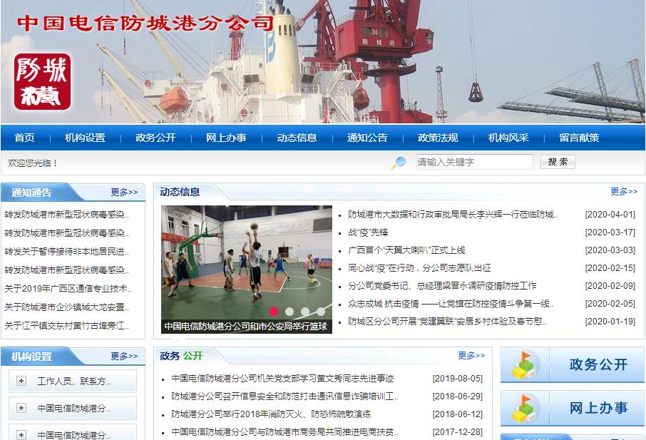 中国电信股份有限公司防城港分公司隶属中国电信广西公司,下辖中国电信股份有限公司东兴分公司、中国电信股份有限公司上思分公司、中国电信股份有限公司防城港港口区分公司、中国电信股份有限公司防城港防城区分公司、中国电信股份有限公司防城港企沙分公司。分公司在防城港市行政区域内经营800MHZCDMA第二代数字蜂窝移动通信业务和CDMA2000第三代数字蜂窝移动通信业务;固定网本地电话业务(含本地无线环路业务)、固定网国内长途电话业务、固定网国际长途电话业务、IP电话业务(限于phone-phone)、卫星国际专线业务、因特网数据传送业务、国际数据通信业务、公众电报和用户电报业务、用户驻地网业务、网络托管业务;在线数据处理与交易处理业务、国内因特网虚拟专用网业务、因特网数据中心业务;语音信箱业务、传真存储转发业务、X400电子邮件业务、呼叫中心业务、因特网接入服务业务和信息服务业务(含固定网电话信息服务业务、互联网信息服务业务和移动信息服务);与通信及信息业务相关的系统集成、技术开发、技术服务、技术培训、技术咨询、信息咨询、设备及计算机软硬件等的生产、销售、安装和设计与施工;房屋租赁;通信设施租赁;安全技术防范系统的设计、施工和维修;广告业务。分公司勇担社会责任,助推防城港经济发展。大力开展平安防城港、电子政务、农村信息化、社会公共信息服务等领域建设,实现了防城港信息化全域覆盖,填平了城乡数字鸿沟,为政府与群众联系和沟通搭建了新的桥梁,有力推动了政府转变职能、提高了办事效率,得到了国家有关部委和自治区的高度评价和充分肯定。当前,分公司全力推进“智慧城市”,加快发展“智慧政务”、“智慧产业”、“智慧民生”,对打造全海景生态海湾城市和加快建设成为广西北部湾经济区“三基地一中心”的先行区必将起到重要的推动作用。分公司秉承“用户至上,用心服务”的企业理念,为广大用户提供更为方便、快捷的通信服务,以优质服务和雄厚的网络实力助推防城港经济腾飞。