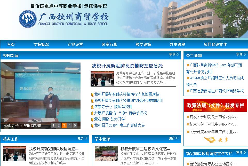 广西钦州商贸学校创办于1979年,是自治区直属全日制省部级重点中等职业学校和自治区示范性特色中等职业学校,隶属广西壮族自治区供销合作联社管理。当时名称为广西供销学校钦州分校,1988年经自治区人民政府批准更名为广西钦州供销学校,1996年再次经自治区人民政府批准更为现名。学校开设有会计、计算机应用、电脑美术设计与制作、学前教育、电子商务、市场营销、物流管理、计算机网络技术、计算机与数码产品维修等专业,其中会计专业和计算机应用专业是自治区级示范性专业。建设有自治区级会计实训基地和国家级计算机实训基地。学校与广西科技大学(原广西工学院)、广西财经学院、石家庄铁道大学等联合开办成人教育,开设有高升专、专升本函授班。学校现有教职工146人,其中高级讲师21人,国家级骨干教师13人,自治区级骨干教师18人,“双师型”教师53人;在校生4832人,其中中专生3150人,大专、本科函授生1682人。学校坚持“以中职教育为主、成人教育为辅、兼顾技能培训”的办学思路,坚持“工学结合、校企合作、顶岗实习”的办学模式,贯彻“以教学质量求生存、以办学特色求发展、以强化管理上水平,以适应市场促创新”的办学原则,坚持“质量立校、发展兴校、特色强校”的办学方向,树立“学生为本、品行为首、技能为主、就业为重”的工作目标,秉承“让学生成才、让家长放心、让社会满意”的办学宗旨,务求使学生“学会学习、学会工作、学会发展"。学校教学教研成果显著,近几年来教职工共发表了教学研究与教学改革论文300多篇,参与自治区级教育教学改革立项28项;学生在广西中等职业教育技能比赛中成绩名列前茅,多次代表广西参加全国职业院校技能大赛。 2013年获全国职业院校技能大赛(中等职业学校组)计算机辅助设计(CAD)项目二等奖、数字影音后期制作技术项目三等奖。学校多次荣获自治区级和市级“教育先进单位”、“卫生优秀学校”、“无毒单位”、“治安稳定单位”等称号。