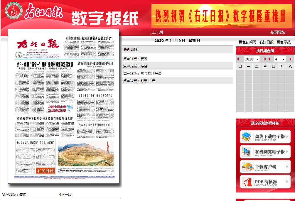 | 网站简介: 右江日报电子版,右江日报多媒体数字报。《右江日报》创办于1929年百色起义前夕,是邓小平等老一辈无产阶级革命家创办的一张具有光荣革命传统的报纸。2008年1月1日,右江日报社隆重向全球推出《右江日报》数字报,她是《右江日报》在网络平台上的完整再现,能快速下载和保存,还能提供智能化的检索功能,方便读者查询资讯,成为宣传百色、推介百色的新平台,成为壮乡红城、千姿百色形象展示的新途径、新优势。 |
