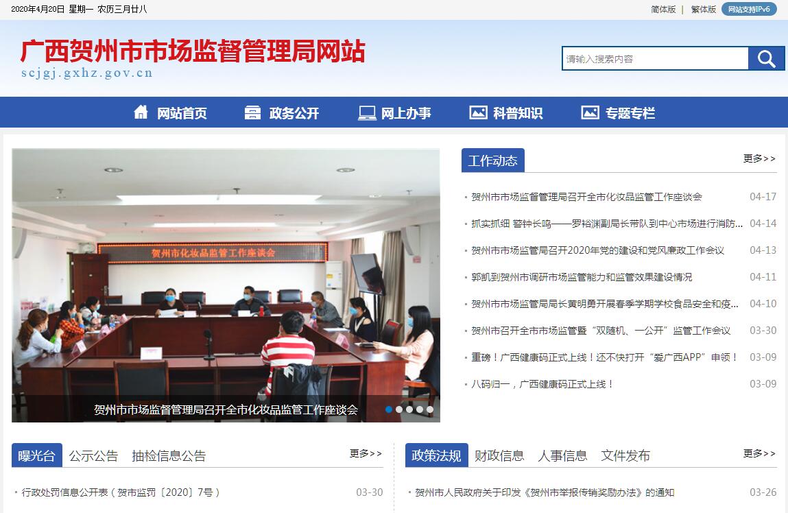 贺州市市场监督管理局主要职责:(一)负责全市市场综合监督管理。起草市市场监督管理有关管理制度措施等规范性文件,制定有关政策、标准,组织实施质量强贺战略、食品安全战略、标准化战略、知识产权战略。拟订并组织实施有关规划,规范和维护市场秩序,营造诚实守信、公平竞争的市场环境。(二)负责全市市场主体统一登记注册。指导全市各类企业、农民专业合作社和从事经营活动的单位、个体工商户等市场主体的登记注册工作。依法办理市本级企业登记注册。建立市场主体信息公示和共享机制,依法公示和共享有关信息,加强信用监管,推动市场主体信用体系建设。(三)负责组织和指导全市市场监督管理综合行政执法工作。指导市场监督管理综合行政执法队伍建设,推动实行统一的市场监管。组织查处重大违法案件。规范市场监督管理和知识产权行政执法行为。(四)负责反垄断统一执法。统筹推进竞争政策实施,指导实施公平竞争审查制度。依授权负责垄断协议、滥用市场支配地位和滥用行政权力排除、限制竞争等反垄断执法工作。依法对经营者集中行为进行监督,并依据委托开展调查。(五)负责监督管理全市市场秩序。依法监督管理市场交易、网络商品交易及有关服务的行为。组织指导查处价格收费违法违规、不正当竞争、违法直销、传销、违法广告、制售假冒伪劣、侵犯商标专利知识产权等行为。指导广告业发展,监督管理广告活动。指导贺州市消费者权益保护委员会开展消费维权工作。(六)负责宏观质量管理。拟订实施全市质量发展的制度措施。统筹质量基础设施建设与应用。会同有关部门组织实施重大工程设备质量监理制度,组织重大质量事故调查,建立并统一实施缺陷产品召回制度,监督管理产品防伪工作。(七)负责产品质量安全监督管理。组织实施产品质量监督抽查、风险监测工作。组织实施质量分级制度、质量安全追溯制度。负责纤维质量监督工作。实施工业产品生产许可管理。(八)负责特种设备安全监督管理。综合管理特种设备安全监察、监督工作。监督检查高耗能特种设备节能标准和锅炉环境保护标准的执行情况。依法承担特种设备安全事故调查工作。(九)负责食品安全监督管理综合协调。统筹指导食品安全工作。负责食品安全应急体系建设,组织指导重大食品安全事件应急处置和调查处理工作。建立健全食品安全重要信息直报制度。承担市食品安全委员会日常工作。(十)负责食品安全监督管理。建立覆盖食品生产、流通、消费全过程的监督检查制度和隐患排查治理机制并组织实施,防范区域性、系统性风险。推动建立食品生产经营者落实主体责任的机制,健全食品安全追溯体系。组织开展食品安全监督抽检、风险监测、核查处置和风险预警、风险交流工作。组织实施特殊食品监督管理。按职责分工,负责指导、实施辖区内食品生产、食品经营企业的许可工作。(十一)负责统一管理计量工作。贯彻执行国家计量制度,推行法定计量单位,依职责管理计量器具及量值传递和比对工作。规范、监督商品量和市场计量行为。(十二)负责统一管理标准化工作。依法协调指导和监督地方标准、团体标准制修订工作。组织实施国家、行业及地方标准,组织制定并实施标准化发展战略,规范标准化活动。(十三)负责统一管理认证认可与检验检测工作。组织实施认证认可与检验检测监督管理的制度措施。推进检验检测机构改革。规划指导全市认证认可与检验检测行业发展。依法监督管理认证认可与检验检测工作。(十四)负责市场监督管理科技和信息化建设、新闻宣传、对外交流与合作。参与开展相关工作对外谈判。按规定承担技术性贸易措施有关工作。(十五)组织指导个体私营经济发展与监督管理。扶持全市个体私营经济发展。指导查处无照生产经营和相关无证生产经营行为。指导全市市场监督管理部门配合党委组织部门开展小微企业、个体工商户、专业市场的党建工作。(十六)负责促进知识产权运用。拟订知识产权激励奖励制度、知识产权转化运用和交易运营政策措施并组织实施。指导落实商标、专利、原产地地理标志等申请的审查、确权相关前置服务工作。指导知识产权无形资产评估工作。指导和促进知识产权服务业发展。统筹指导知识产权公共服务体系建设,推动知识产权信息传播利用。(十七)负责保护知识产权。拟订严格保护商标、专利、原产地地理标志等知识产权制度措施并组织实施。研究提出知识产权保护体系建设方案并组织实施,推动建设知识产权保护体系。负责组织指导商标、专利执法工作,指导知识产权争议处理、维权援助和纠纷调处。统筹协调知识产权风险预测预警和涉外保护工作。拟订实施鼓励新领域、新业态、新模式创新的知识产权保护、管理和服务政策。(十八)药品、医疗器械和化妆品监督管理的主要职责:1.负责全市药品(含中药、民族药,下同)、医疗器械和化妆品安全监督管理。2.监督实施全市药品、医疗器械、化妆品标准和分类管理制度。3.负责全市药品零售、医疗器械经营环节的许可。4.负责全市药品零售、药品使用、医疗器械和化妆品质量管理。监督实施药品经营质量管理规范。5.负责全市药品、医疗器械和化妆品上市后风险管理,组织指导开展药品不良
