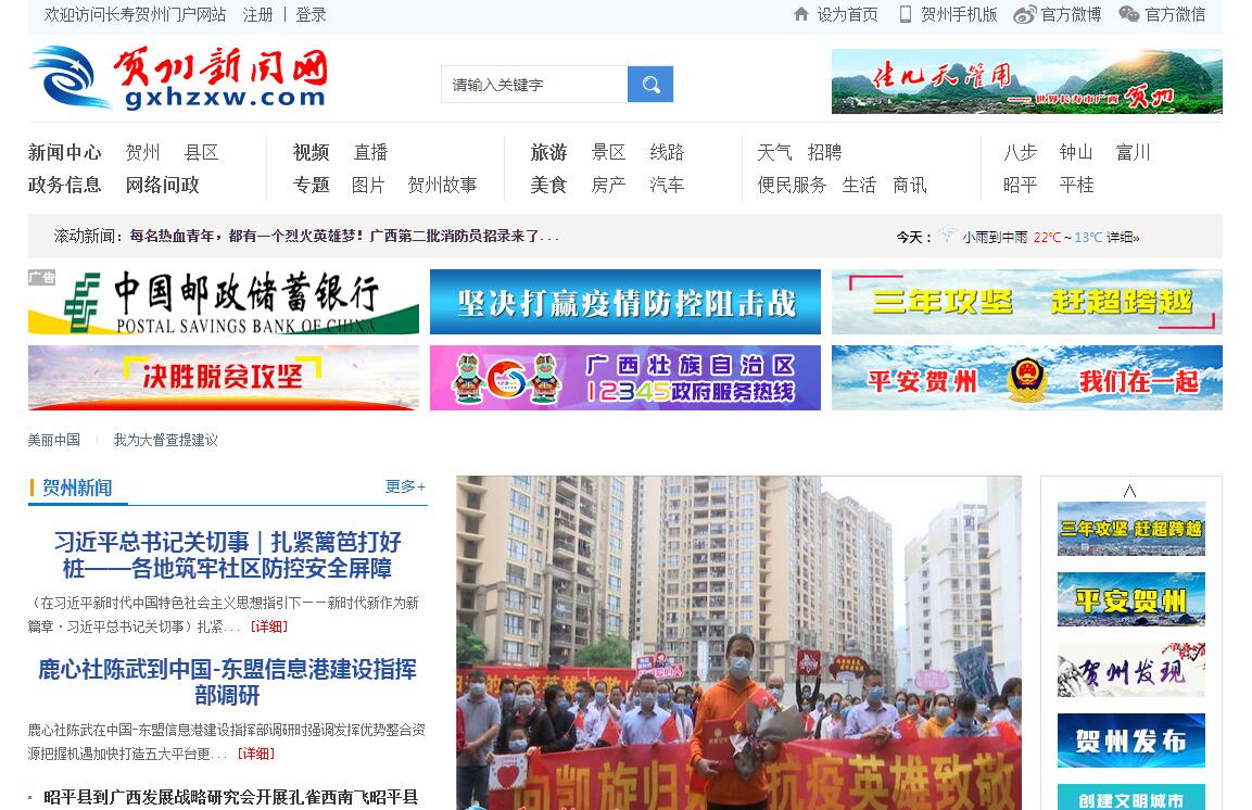 | 网站简介: 贺州新闻网(www.gxhzxw.com)是由贺州市委宣传部主导,贺州市广播电视台主管,贺州市新锐全媒体发展有限公司运营的我市重点新闻门户网站。贺州新闻网整合了贺州电视的视频节目、广播电台的新闻综合广播、交通音乐广播及贺州日报社旗下《贺州日报》等优势资源,可实现打开网络看电视,听广播,看报纸,是集新闻资讯、网络问政、便民服务、社区论坛等内容于一体的综合性新闻门户网站。 |
