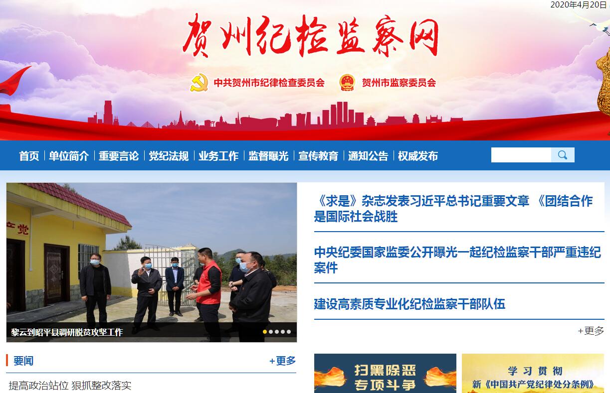 贺州纪检监察网由中共贺州市纪律检查委员会、贺州市监察局主办。中共贺州市纪律检查委员会与贺州市监察局合署办公,履行党的纪律检查和政府监察职能,根据《党章》和《中华人民共和国行政监察法》的有关规定,市纪委接受市委和自治区纪委的双重领导;市监察局仍属市政府序列,接受市人民政府和自治区监察厅的领导。其主要职责为:(一)主管全市党的纪律检查工作。负责贯彻落实党中央、中央纪委、自治区党委、自治区纪委、市委关于加强党风廉政建设的决定,维护党的章程和党内法规,检查党的路线、方针、政策和决议的执行情况,重点检查监督县(处)级党员领导干部执行党的路线、方针、政策的情况以及思想作风等方面的问题,协助市委抓好党风廉政建设和反腐败斗争。(二)主管全市行政监察工作。负责贯彻落实党中央、国务院和上级纪检监察机关以及市委、市人民政府有关行政监察工作的决定;监督检查市人民政府各部门及其工作人员、各县(区)人民政府及其负责人、市人民政府直属企事业单位及其由国家行政机关任命的领导干部执行国家政策和法律、法规、国民经济和社会发展计划及自治区人民政府、市人民政府颁发的决议、规定和命令的情况。(三)负责检查并处理市委和市人民政府各部门、各县(区)党的组织和市委管理的党员领导干部违反党的章程及党内法规的案件或其他重要、复杂案件,决定或取消对这些案件中党员的处分;受、理党员的控告和申诉,保护党员的民主权利和合法权益。(四)负责调查处理市人民政府各部门及其工作人员、各县(区)人民政府、市人民政府直属企事业单位及国家行政机关任命的领导干部违反国家政策和法律、法规以及违反政纪的行为,审理决定或建议对他们做出行政处分(涉及选举产生的领导干部按法定程序办理);受理监察对象不服政纪处分的申诉,受理个人或单位对监察对象违纪行为的检举、控告;保护监察对象的正当权利和合法权益。(五)负责作出关于维护党纪的决定,制定党风党纪教育规划,配合有关部门做好党的纪检工作方针、政策的宣传工作和对党员进行遵守纪律的教育工作;组织和指导全市纪检、监察系统干部的培训工作。(六)会同有关部门做好行政监察工作的方针、政策和法律、法规的宣传工作,教育国家机关工作人员遵纪守法,为政清廉。(七)负责对党的纪律检查工作理论及有关问题进行调查研究,草拟有关规定。(八)调查研究市人民政府各部门和各县(区)制订有关政策的情况,对有违背纪律监察条例行为的政策措施提出修改意见。(九)会同市直属有关部门以及各县(区)党委和人民政府做好纪检监察干部的管理工作。按照干部管理权限,审核各县(区)纪委机关、监察局领导干部以及市政府有关部门纪检组长、副组长(纪委书记、副书记)、监察室主任、副主任人选,提出任免意见。(十)承办市委、市人民政府和自治区纪委、监察厅交办的其他事项。
