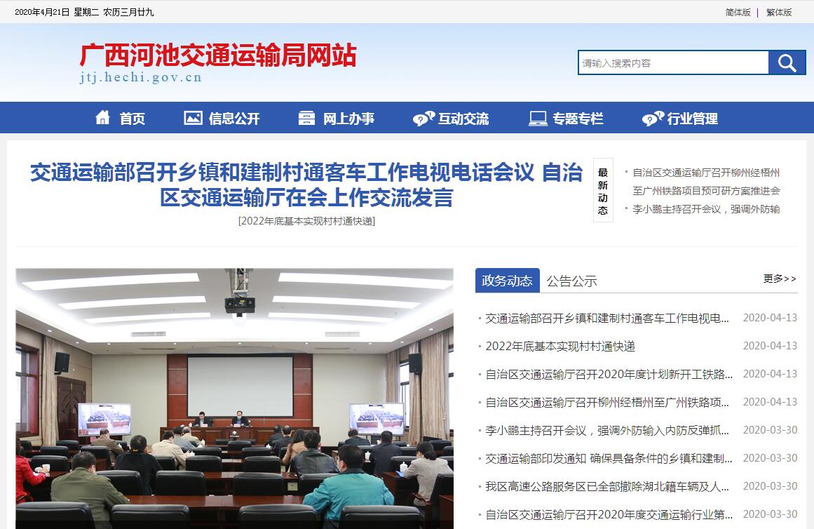 河池市交通运输局主要职责:(一)承担涉及全市综合运输体系的规划协调工作,会同有关部门组织编制综合运输体系规划,指导交通运输枢纽规划和管理。(二)贯彻执行国家、自治区有关交通运输的方针政策和法律法规,行业规划和标准。组织拟订并监督实施全市公路、水路等行业规划、政策和标准。组织起草交通运输工作的地方规范性文件。参与拟订物流业发展规划,拟订有关政策和标准并监督实施。指导公路、水路运输行业有关体制改革工作。(三)承担全市道路、水路运输行业监管责任。指导并监督实施道路、水路运输有关政策、准入制度、技术标准和运营规范。负责市本级公共交通和出租汽车管理,指导城乡客运及有关设施规划与管理工作;负责营运汽车运输、船舶跨市(地级市)运输及地方航道管理工作。(四)负责提出全市农村公路、水路固定资产投资规模和方向、国家及自治区、市级财政性资金安排意见、建议,并监督实施。按规定权限审批、核准国家、自治区和市政府规划内和年度计划内固定资产投资项目。提出有关财政、土地、价格等政策的建议。(五)承担全市农村公路、水路建设市场监管责任。拟订全市公路、水路工程建设相关政策、制度和技术标准并监督实施。组织协调公路、水路交通基础设施建设的工程质量、安全生产监督管理工作。指导公路、水路基础设施管理和维护。依法负责港口、航道的规划和管理工作。监督管理公路、水路建设项目招投标活动。(六)指导全市公路、水路行业安全生产和应急管理工作。按规定组织协调重点物资和紧急客货运输;负责全市地方公路网安全运行监测和协调;承担国防动员有关工作。(七)指导全市交通运输信息化建设、监测分析运行情况,开展相关统计工作,发布有关信息。指导公路、水路行业环境保护、科技开发、工程造价和节能减排工作。指导行业教育、培训和精神文明工作;指导交通运输行业单位内部治安保卫、综合治理及维护稳定工作。(八)依法管理全市公路、道路运输、港口航道行政执法(含治理地方公路超限)工作。指导港口设施保安工作。(九)对机关、直属单位国有资产进行监督管理。组织实施交通运输行业内部审计工作。(十)指导协调公路、水路运输行业利用外资工作,开展对外合作与交流。(十一)承办市人民政府交办的其他事项。