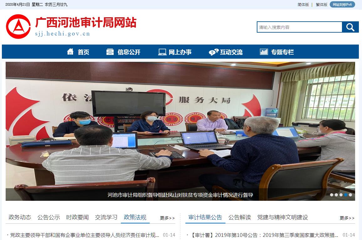 河池市审计局(原河池地区审计局),成立于1984年10月,是河池市人民政府工作部门,在市长和审计厅的双重领导下,负责全市的审计工作。其主要职责是:(一)主管全市审计工作。负责对国家财政收支和法律法规规定属于审计监督范围的财务收支的真实、合法和效益进行审计监督,维护国家财政经济秩序,提高财政资金使用效益,促进廉政建设,保障国民经济和社会健康发展。对审计、专项审计调查和核查社会审计机构相关审计报告的结果承担责任,并负有督促被审计单位整改的责任。(二)制定并组织实施全市审计工作发展规划和专业领域审计工作规划,制定并组织实施年度审计计划。拟订全市地方性审计政策和相关规定并监督执行。对直接审计、调查和核查的事项依法进行审计评价,做出审计决定或提出审计建议。(三)向市长提出年度市本级预算执行和其他财政收支情况的审计结果报告。受市人民政府委托向市人大常委会提出市本级预算执行和其他财政收支情况的审计工作报告、审计发现问题的纠正和处理结果报告。向市人民政府报告对其他事项的审计和专项审计调查情况及结果。依法向社会公布审计结果。向市人民政府有关部门和市辖县(区)人民政府通报审计情况和审计结果。(四)依法审计下列事项,出具审计报告,在法定职权范围内做出审计决定或向有关主管机关提出处理处罚的建议:1.市本级预算执行情况和其他财政收支,市本级各部门(含直属单位)预算的执行情况、决算和其他财政收支。2.市辖县(区)人民政府预算的执行情况、决算和其他财政收支,中央、自治区和市财政转移支付资金。3.使用市财政资金的事业单位和社会团体的财务收支。4.市人民政府投资和以市人民政府投资为主的建设项目的预算执行情况和决算。5.市国有企业和金融机构、市人民政府规定的市国有资本占控股或主导地位的企业和金融机构的资产、负债、损益。6.市人民政府主管部门、市辖县(区)人民政府管理和其他单位受市人民政府及其部门委托管理的社会保障基金、社会捐赠资金以及其他有关基金、资金的财务收支。7.根据上级审计机关授权,对国际组织和外国政府援助、贷款项目的财务收支和项目执行情况。8.法律、法规规定应当由市审计局审计的其他事项。(五)按规定对县处级领导干部及依法属于市审计局审计监督对象的其他单位主要负责人实施经济责任审计。(六)组织实施对国家财经法律、法规、规章、政策和宏观调控措施执行情况、财政预算管理或国有资产管理使用等与市本级财政收支有关的特定事项进行专项审计调查。(七)完成审计厅、市委、市政府决定的其它事项。