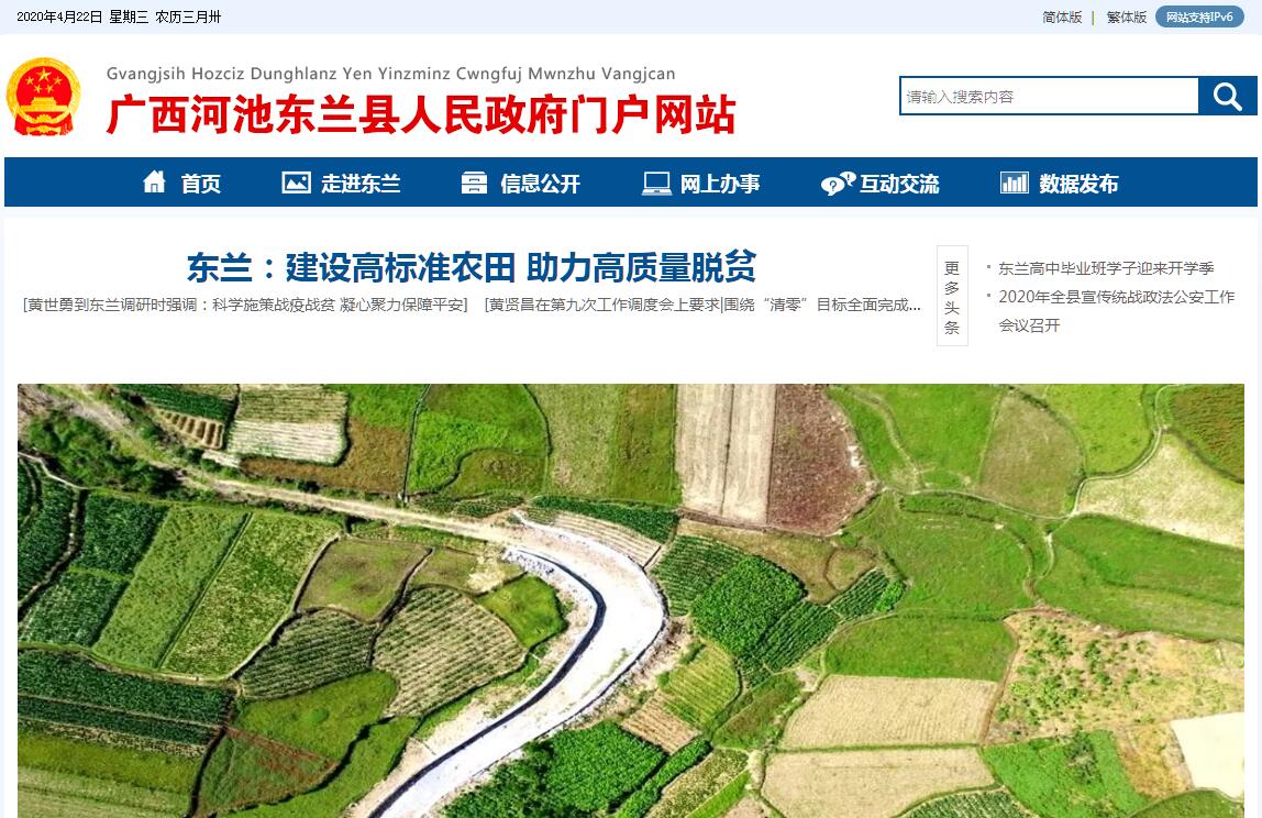 | 网站简介: 东兰县地处桂西北,云贵高原南缘,红水河中游;东傍金城江区,西界凤山县,南傍大化、巴马县,北邻 南丹、天峨县,离自治区首府南宁市308公里,距河池市金城江区108公里,面积2415平方公里、辖6镇8乡147个村民委员会2个社区2954个村民小组3613个自然屯,总人口31.38万人(2018年)。地处亚热带,气候温和,雨量充沛,自然资源十分丰富,全县森林覆盖率80.15%。东兰县历史悠久,资源丰富,素有“四乡”(长寿之乡、将军之乡、铜鼓之乡、板栗之乡)之美称。2019年上半年,全县完成地区生产总值13.49亿元,增长6.3%;完成财政收入1.83亿元,增长4.7%;规模以上工业总产值增长5.6%;规模以上工业增加值增长12.6%;固定资产投资增长7.5%;社会消费品零售总额9.26亿元,同比增长7.9%;城镇居民人均可支配收入12273元,增长7.8%;农村居民人均可支配收入3879元,增长11%。 |