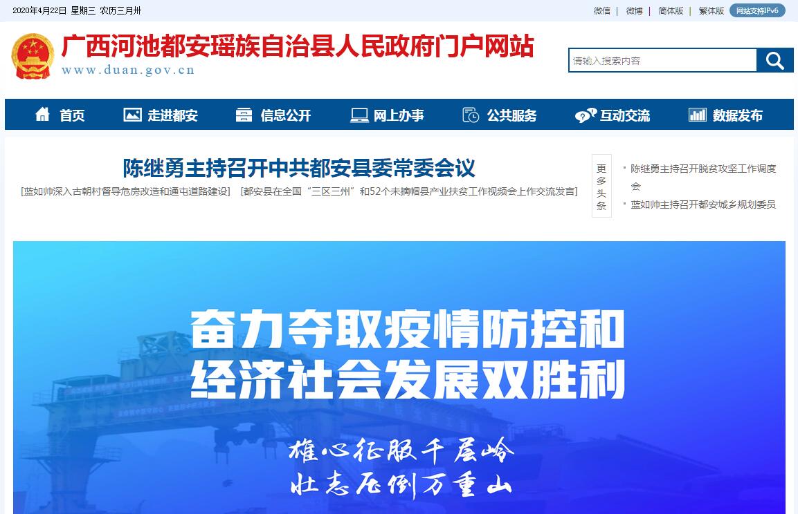 都安瑶族自治县(以下简称都安县)位于广西中部偏西、河池市南部,距南宁和河池市各120公里,兰海高速、国道210线、忻(城)大(化)二级路、在建的贵(阳)南(宁)高铁和贺(州)巴(马)高速公路横穿过境。下辖19个乡镇253个行政村(社区)7201个村民小组,总面积4088平方公里,总人口72.6万人,其中农业人口67多万人。都安是中国布努瑶主要聚居地,是密洛陀文化传承地。都安的县情概括起来为:老、少、山、穷、特。“老”:都安是邓小平、韦拔群等领导的右江革命根据地的重要组成部分,是早期河池农民运动的策源地之一,目前全县19个乡镇全部被列为革命老区。“少”:都安于1955年正式成立瑶族自治县,是全国成立最早、人口最多的少数民族自治县之一,少数民族人口占96.34%,主要为壮、汉、瑶、苗、仫佬、毛南等12个民族,其中瑶族人口占23%。“山”:都安是全国县域幅员面积最大的瑶族自治县,也是石山面积最多的瑶族自治县,石山面积占总面积的89%,人均耕地不足0.7亩,素有“九分石头一分土”之称。“穷”:都安是全国扶贫开发重点县、全国深度贫困县、广西极度贫困县,“十三五”时期需要脱贫13.84万人、需要摘帽147个贫困村,其中深度贫困村106个(含48个贫困发生率在30%以上的深度贫困村),需要易地扶贫搬迁4.68万人,是广西贫困人口和易地扶贫搬迁人口最多、贫困面最广、贫困程度最深、脱贫任务最重的县份,被列为广西四个极度贫困县之一。“特”:都安处于广西桂西资源富集区、西南出海大通道重要节点和西江经济带上游,区位优势明显,自然资源丰富,有位居中国第一、亚洲第二的地下河水系;有300多个地下河天窗,被称为“世界地下河天窗之都”;有目前国内唯一集河流湿地、城市湿地、农耕湿地于一身的湿地。同时,都安还被称为“中国野生山葡萄红酒基地”“中国竹藤草芒编织工艺品之乡”“中国都安山羊之乡”。近年来,都安县深入学习贯彻习近平新时代中国特色社会主义思想,全面落实习近平总书记对广西工作的重要指示精神,以习近平总书记“建设壮美广西 共圆复兴梦想”重要题词精神作为思想引领和力量源泉,按照自治区“六壮六美”建设目标,以脱贫攻坚统领经济社会发展全局,紧紧抓住扶贫开发、高铁建设、乡村振兴等三大发展机遇,大力弘扬“雄心征服千层岭,壮志压倒万重山”的都安精神,深入实施“生态立县、扶贫稳县、工业强县、城镇热县、旅游旺县、科教兴县”的“六个县”战略,攻坚克难,砥砺奋进,推动县域经济健康稳定发展,脱贫攻坚取得阶段性胜利,城乡面貌日新月异,群众生活大幅改善。脱贫攻坚形成“一养一种一车间,一库一战一保障”发展格局,三年共脱贫出列43个贫困村8.2万贫困人口,易地扶贫搬迁4.2万人,贫困发生率下降13.4个百分点;2018年全县地区生产总值56.5亿元,增长12.1%;固定资产投资增长3.2%;财政收入5.38亿元,增长10%;规模以上工业总产值增长16.1%;社会消费品零售总额26.88亿元,增长9.7%;全体居民人均可支配收入13930元,增长9.6%,其中城镇居民人均可支配收入23812元,增长7.1%;农村居民人均可支配收入8105元,增长12%。地区生产总值突破50亿元大关,财政收入突破5亿元大关,多项主要经济指标呈两位数增长,特别是农村居民人均可支配收入增速排全区首位。下一步,都安县将坚持以习近平新时代中国特色社会主义思想为指导,紧紧围绕极度贫困,聚焦“脱贫大攻坚、项目大会战、市政大突破”三大工程,对标“环境大整治、乡村大振兴、民生大改善”三大工作,强化干部作风建设,坚定攻坚信心,把稳攻坚方向,强化攻坚举措,持续推进脱贫攻坚战和经济建设各项部署落到实处,努力与全国全区如期脱贫摘帽,奋力谱写新时代发展新篇章。