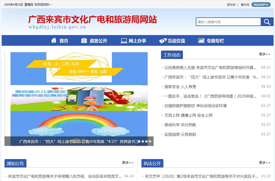 来宾市文化广电和旅游局是市人民政府工作部门,为正处级。来宾市文化广电和旅游局贯彻落实党中央、自治区党委和市委关于文化、广播电视、旅游工作的方针政策和决策部署,在履行职责过程中坚持和加强党对文化、广播电视、旅游工作的集中统一领导。其主要职责是:(一)贯彻执行党和国家关于文化、广播电视、旅游工作的方针政策和法律法规;起草全市文化、广播电视、旅游工作的地方性法规、政府规章和政策措施并组织实施。(二)组织指导和协调全市文化事业、文化产业、广播电视领域事业和旅游业的改革和发展工作,拟订发展规划和年度计划并组织实施,推进全市文化、广播电视领域和旅游体制机制改革。(三)指导全市性重大文化、旅游活动,组织实施广播电视公共服务重大公益工程,指导全市文化、广播电视和旅游项目建设。组织全市旅游整体形象推广,促进文化产业和旅游产业对外合作和国内外市场推广,制定旅游市场开发战略并组织实施。推进全市文化广电和旅游建设、发展。指导和推进全域旅游、特色旅游、乡村旅游、红色旅游。(四)指导和管理全市文艺事业,指导艺术创作与生产,扶持体现社会主义核心价值观、具有导向性代表性示范性的文艺作品,推动各门类艺术、各艺术品种发展。(五)负责全市公共文化事业发展,推进全市公共文化服务体系建设和旅游公共服务建设,深入实施文化惠民工程,统筹推进基本公共文化服务标准化、均等化和旅游公共服务标准化。(六)推进文化、广播电视和旅游科技创新发展。推进全市文化和旅游行业信息化、标准化建设,指导行业职业教育培训工作。推进广电网与电信网、互联网三网融合。(七)负责全市非物质文化遗产保护,推动非物质文化遗产挖掘、保护、传承、普及、弘扬和振兴。(八)统筹规划全市文化产业和旅游产业,组织实施文化和旅游资源普查、挖掘、保护和利用工作。促进文化、旅游与相关产业融合发展。(九)指导全市文化和旅游市场发展。对文化和旅游市场经营进行行业监管,推进文化和旅游行业信用体系建设,依法规范文化和旅游市场。协调和指导全市假日旅游工作。负责文化和旅游系统应急安全监督管理工作。(十)指导、监督全市文化广电和旅游市场综合执法工作。组织查处全市性、跨区域文化、文物、出版、广播电视、旅游等市场的违法行为,维护和规范市场秩序。(十一)对全市广播电视节目传输覆盖、监测和安全播出进行监管,指导、推进全市的国家应急广播体系建设。指导、协调全市广播电视系统应急安全和保卫工作。(十二)对各类广播电视机构进行行业管理,会同有关部门对网络视听节目服务机构进行管理。实施依法设定的行政许可。(十三)指导和管理全市文化、广播电视和旅游对外交流、合作和宣传、推广工作。组织实施文化和旅游对外交流合作活动。参与推动全市广播电视领域“走出去”工作,负责广播电视节目的进口、收录和管理。(十四)统筹规划全市文物、博物馆事业发展,组织协调文物资源调查、文物保护和考古以及,文物资源资产管理、合理利用、文物安全工作,指导全市博物馆、文物管理机构业务建设。(十五)指导全市电视剧行业发展和电视剧创作生产。监督管理、审查全市广播电视节目、网络视听节目和公共视听载体播放视听节目的内容。指导、监管广播电视广告播放。(十六)指导全市文化、广播电视、网络视听和旅游行业的人才队伍建设。(十七)监测全市文化广电和旅游产业经济运行,负责旅游统计、分析和信息发布工作。(十八)完成市委、市人民政府交办的其他任务。