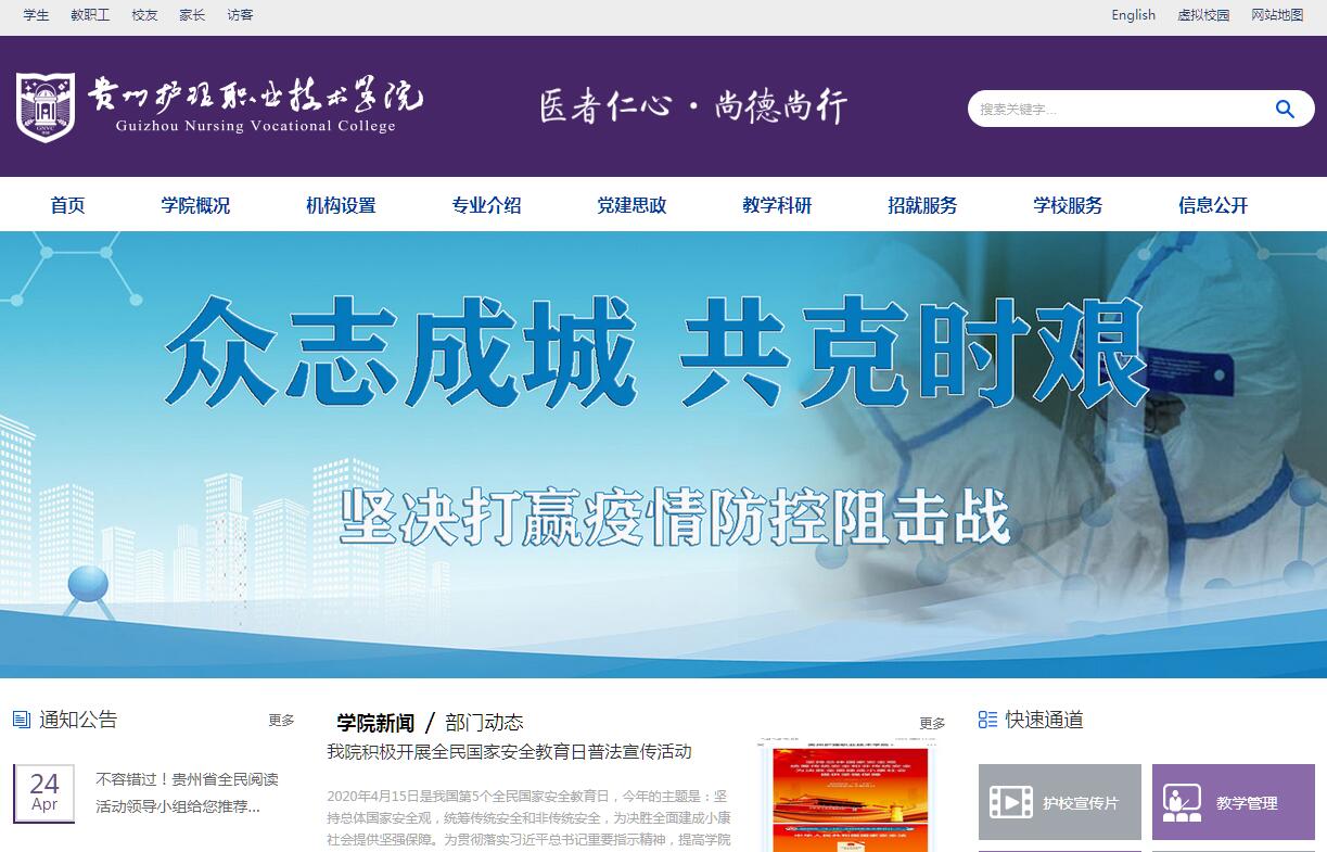 贵州护理职业技术学院是经贵州省人民政府批准,经教育部备案的一所公办全日制高等专科职业院校。学院由贵州省卫生和计划生育委员会实行行业主管,是一所集学历教育、短期培训和继续教育为一体的综合性全日制公办学校,首批开设护理、助产、康复技术三个专业,计划招生1000人。学院总占地面积462亩,建筑面积16.8114万㎡,建有数字化校园系统,建成功能完善的校内实践教学基地,各种教学仪器设备总值2469万元。学院内建有全国先进、省内一流的护理实训中心,建筑面积1.1916万㎡,内有标准化实训室67间。其中建有解剖实训、护理实训、内科实训、外科实训、急救实训、妇科实训、儿科实训、产科实训、康复实训等9大类实训基地,综合实训中心在整体文化氛围上与医院高度契合,内部环境上与医院高度仿真,可面向学院所有专业开展实践性教学,保证专业教学紧贴技术进步和临床实际。学院教学团队师资完备,现有专任教师180人,专业课教师153人,公共课教师27人;大学本科及以上学历173人,其中硕士研究生49人,博士研究生18人,“双师型”教师141人,占专任教师总数的78.33%。专任教师数量、学科结构、学历结构和职称结构符合高等专科学校设置标准,完全能满足相关专业的教学需要。学院以培养高素质护理专业实用人才为目的,是贵州省职教学会副会长单位,贵州省护理职业教育集团理事长单位,贵州省职教学会医护类专业委员会主任委员单位,贵州省康复医学会护理专业主任委员单位,贵州省人民医院研究生培训基地、贵州省人民医院全科医学技能培训基地、贵州省人民医院住院医师规范化培训技能培训基地、贵州省人民医院护士技能培训基地、贵州医科大学-贵州省人民医院临床技能综合培训中心。