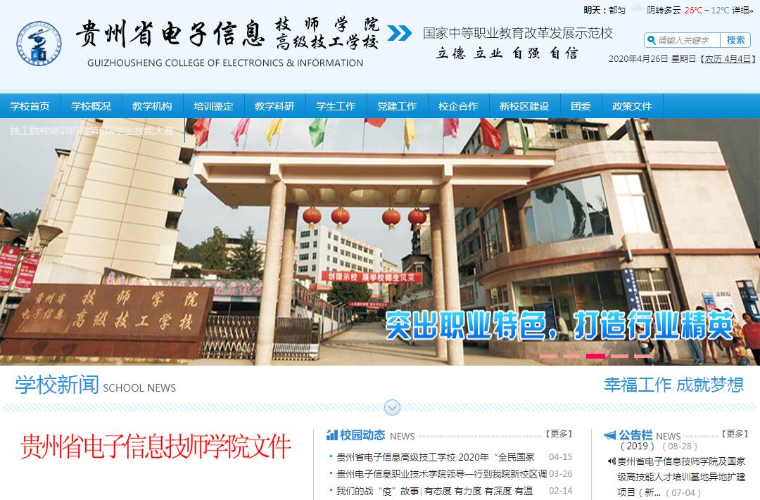 贵州省电子信息技师学院创建于1975年10月,隶属贵州省经济和信息化委员会,是省属全额拔款的事业单位。学院以培养中高级技能人才、服务经济社会、服务百姓就业为宗旨。贵州省电子信息技师学院是国家级重点技工学校,贵州省首批中职示范学校,贵州省唯一一所国家中等职业教育改革发展示范学校技工院校,国家级高技能人才培训基地,中国振华电子集团公司和黔南州技师、高级技师考评基地。学院位于贵州省黔南布依族苗族自治州首府都匀市。开设有32个高级技工和技师专业,现有在校生6328人。在职教职工306人,具有高级职称教师比例达到25%,技师和高级技师比例达到60%以上;专业课教师中“双师型”教师比例达到93.62%,专业带头人31名,骨干教师64名,行业企业兼职教师55名。教师队伍整体实力达到全国中职院校先进水平。学院占地500余亩,建筑面积23万平方米,固定资产9500万元,其中各类先进教学设备价值6000余万元。拥有各类实习设备5000余台(套)。学院以重点专业数控技术应用、模具设计与制造、汽车制造与维修、电子技术应用及苗族舞蹈课程特色项目建设为载体,改革以学校和课堂为中心的传统人才培养模式,深化学校与企业双元合作,密切联系企业、事业等用人单位,建立用人单位调研机制,积极创新人才培养模式。学院已在都匀久达机械厂等企业建立14个大型校外实习实训基地,全面实施工学结合、校企合作。主动适应都匀市、黔南州及贵州省装备制造、电子信息、高新技术、商贸服务等产业发展战略,依托职教集团,实施工学交替;开展校企合作,推行顶岗实习;校内实习工厂与企业深度联合办学,实施产教融合。参照企业用人标准构建学校、行业、企业等多方共同参与的评价机制,评定学生的技能水平与职业素质,体现行业、专业特点无缝对接的人才培养模式,教学质量显著提高。近3年,多次承办黔南州中职学校技能大赛、贵州省中职院校技能大赛及第42届世界技能大赛,学生在机电一体化、汽车维修、机械加工、模具制造技术、计算机信息技术、数控技术等专业比赛中,获得一、二、三等奖项100余人次。学院实行技能+学历及“多证书”制,大力推行国家职业资格证书制度。近3年,毕业生双证书获得率达98%以上,就业率保持在98%以上,专业对口率保持在80%以上。学院把职业资格标准融入课程体系,将学生培养融入生产实践之中,高级技工、预备技师、技师毕业生供不应求。建院40年来,已为国家培养各学历层次中高级技能人才4万余人。学院以服务经济社会发展为宗旨,以优质技工教育教学资源,联合省内外相关行业、企业及其他职业学校实施集团化办学,为地区产业结构调整、新型工业化、城镇化建设服务,带动农村及少数民族县市职教发展。积极开展短期职业技能培训和岗位培训,近三年,培训量达11975人次。学院国家第84职业技能鉴定所除对本校100%的专业开展技能鉴定外,充分发挥国家高技能人才培训基地的优势,全力开展本地区中级技工、高级技工及技师层次73个工种职业技能鉴定,近三年,鉴定量达10709人次。对口支援周边地区10所中等职业学校,在区域中职教育中发挥骨干示范作用,为经济社会提供强有力的教育培训和技术服务。学院2002年被国家教育部、经贸委、劳动和社会保障部等三部委授予“全国职业教育先进单位”荣誉称号。2010年6月,被国家教育部、人力资源和社会保障部授予“全国中等职业学校德育工作先进集体”荣誉称号,同年9月,荣获国家人力资源和社会保障部授予的“国家技能人才培育突出贡献奖”称号。2011年,院长邓福军荣获“全国中职学校优秀校长”、“全国技工院校突出贡献奖”称号,孙素兰老师荣获“全国中职学校优秀班主任”称号。2014年再次获教育部等六部委授予的“全国职业教育先进单位”荣誉称号。如今,贵州省电子信息技师学院已发展成为贵州省最强、国内一流的技工院校。