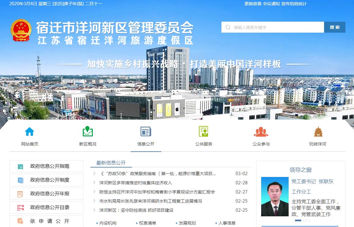 洋河新区位于宿城区南部,与泗阳,泗洪相为彼邻,新区下辖洋河镇、仓集镇、郑楼镇,总面积达200平方公里,总人口超过20万人。境内拥有全国知名酒类品牌洋河酒,地方特产洋河车轮饼也是香飘四方,美人泉的传说更是给底蕴深厚的洋河添加了些许神话内涵。2011年4月29日,为策应全省20个经济比较发达的镇开展行政管理体制改革试点,推进宿迁中心城市“一核多极”发展的重大举措,洋河新城挂牌成立。洋河新城的诞生标志着宿迁中心城市建设翻开了新的一页,也标志着洋河发展迈出了具有里程碑意义的重要一步。2013年6月6日,市委、市政府从发展、便民和科学的角度出发,整合区域资源,促进区域经济社会发展,打造“中心城市发展轴上的重要节点”,将“洋河新城”更名为“洋河新区”,并整建制托管仓集镇、郑楼镇。洋河新区位于宿迁市东南部,是宿迁中心城市发展轴上重要节点城市,距市区约18公里。闻名于世的洋河酒厂坐落于洋河新区。新区下辖三个镇。总面积达200平方公里,总人口超过20万人。洋河新区交通四通八达,依傍航运繁华的古运河和延绵悠长的黄河故道,徐淮、徐宁公路穿境而过,宁宿徐、徐宿淮盐两条高速公路横贯东西,宿淮铁路中心站坐落洋河新区,徐淮轻轨与其交错相连,运河国际港正在规划建设。城区距徐州观音国际机场仅半小时车程,距连云港港口120公里。洋河新区优越的地理位置和发达便捷的交通条件赋予了它独特的区位优势和巨大的发展潜力,加快发展跨越发展的基础条件已经成熟。素有“酒都”之称的洋河,以酒为媒,蓝色经典系列酒香飘四海,名扬天下。洋河新区按照“一年打基础,两年见成效、三年大变样”的总体要求,借助洋河酒业规模扩张、转型的大好机遇加速发展,着力打造工业高地,投资“洼地”,制定优惠政策,吸引外来项目上马,洋河新区现有工业企业600余家,形成了酿酒、纺织、包装物流、木材加工、现代农业五大大主导产业。洋河酒厂工业园启动建设,给洋河发展带来了新的动力。“洋河新区-中国洋河”是宿迁市洋河新区管理委员会门户网站,是洋河新区政务公开的重要窗口,企业、市民办事的重要平台,政府与市民互动的重要渠道。2011年8月建成开通。